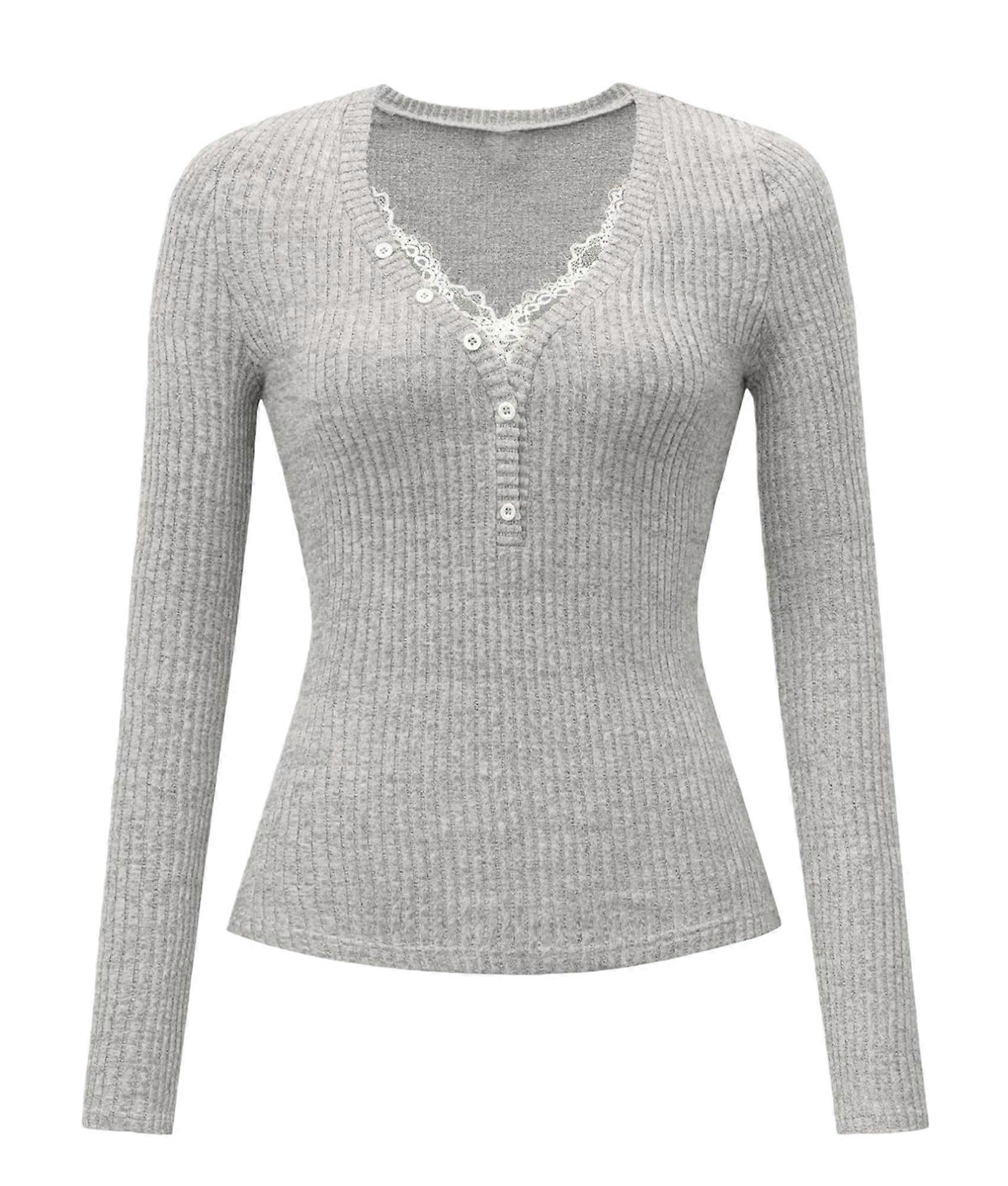Women Lace Henley T Shirts Button Down Slim Fit Tops Long Sleeve V-Neck Tunic Top Blouse Light Gray XXL