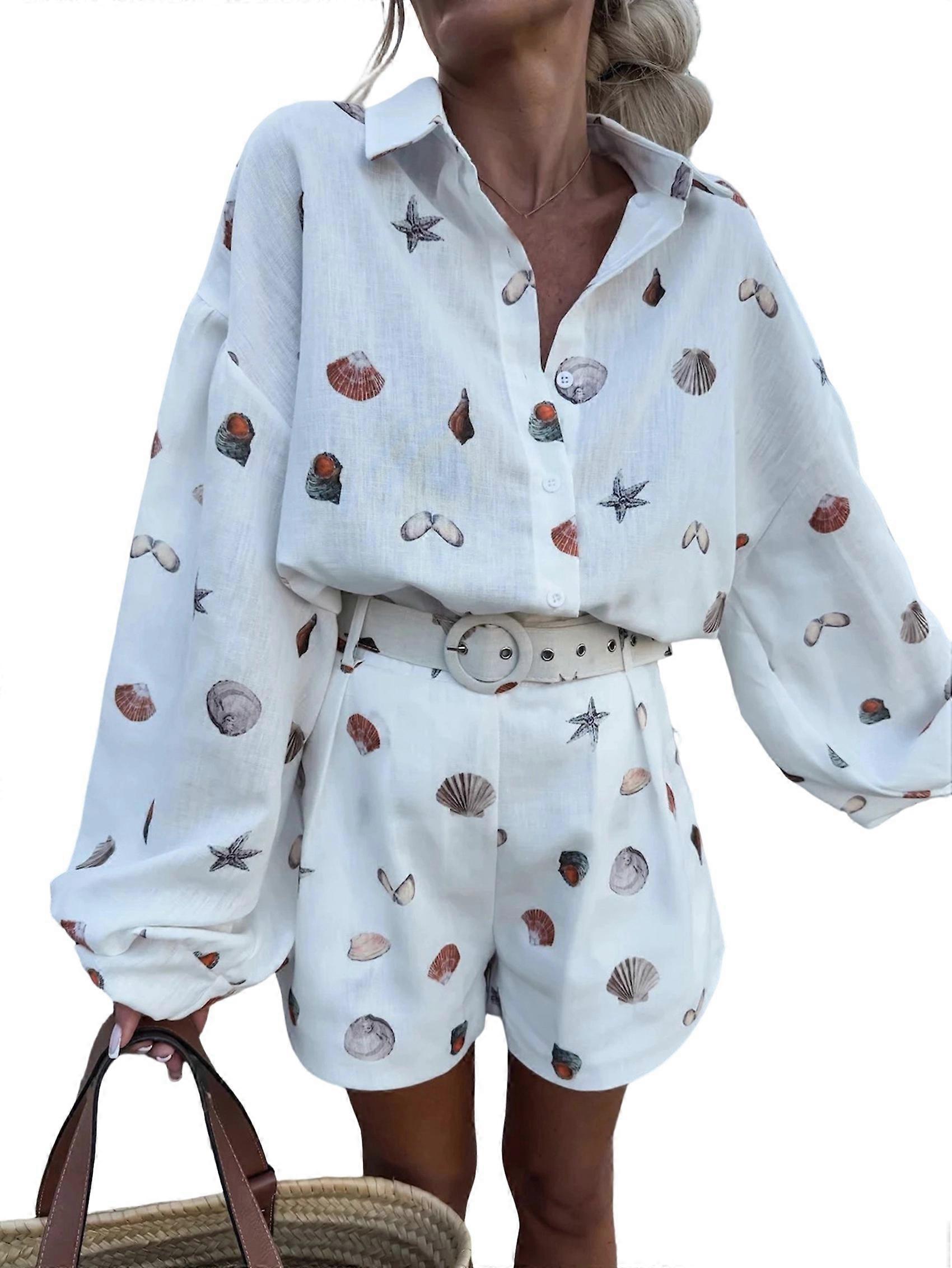 Set for Women Long Sleeve Shirt and Shorts Set White 2 Piece Set L