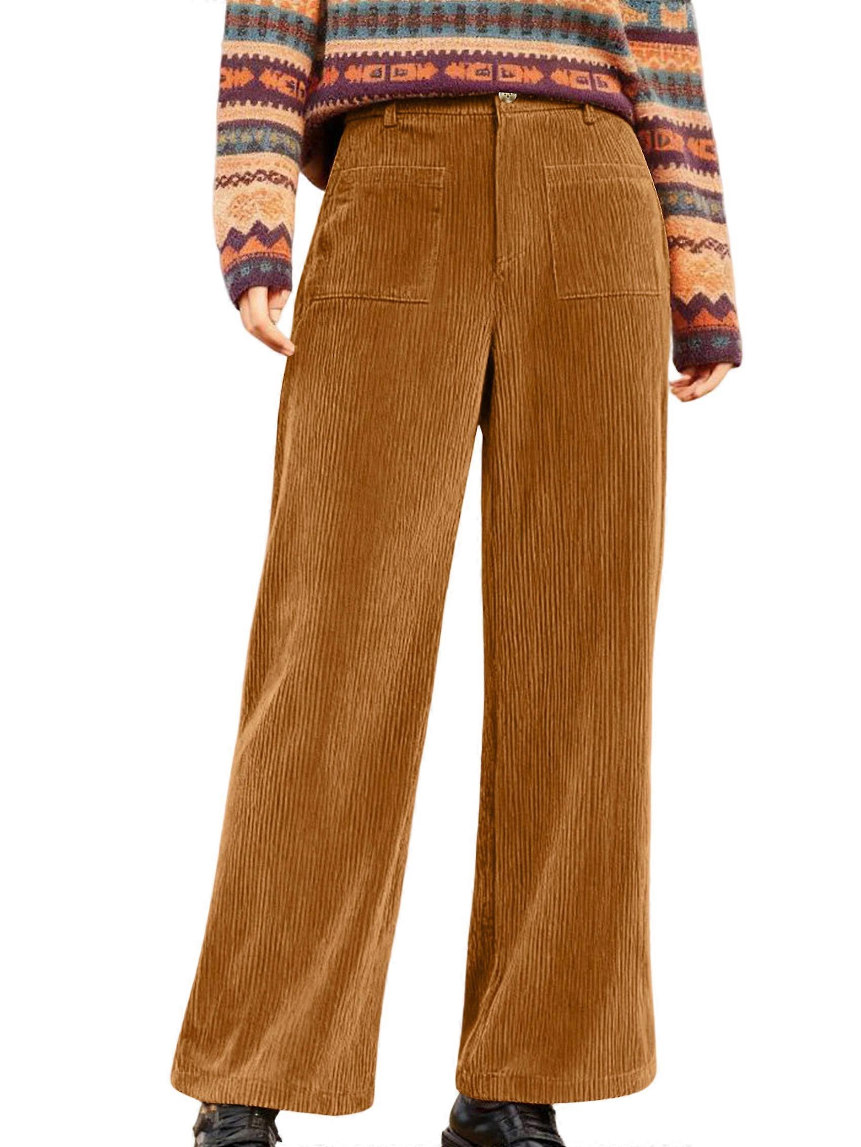 Women'S Corduroy Wide Leg Pants with Patch Pockets Casual Slim Fit Elastic Waist Trousers Beige XL