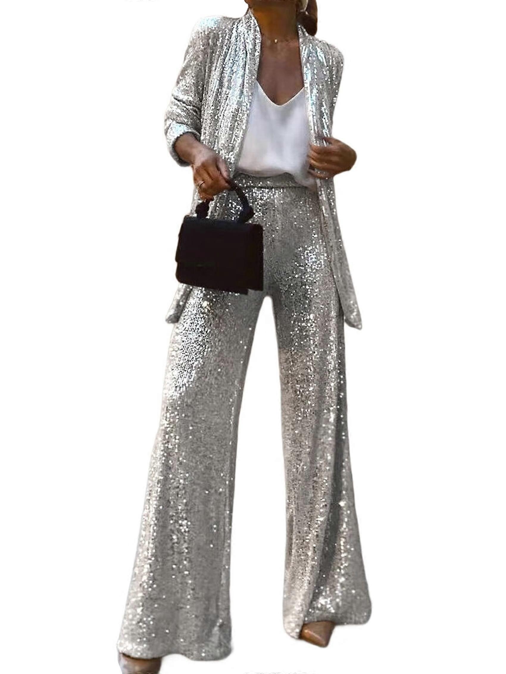 Women'S Sequin Blazer and High-Waist Trousers 2-Piece Set Casual Office Wear Party Suit Silver Set L