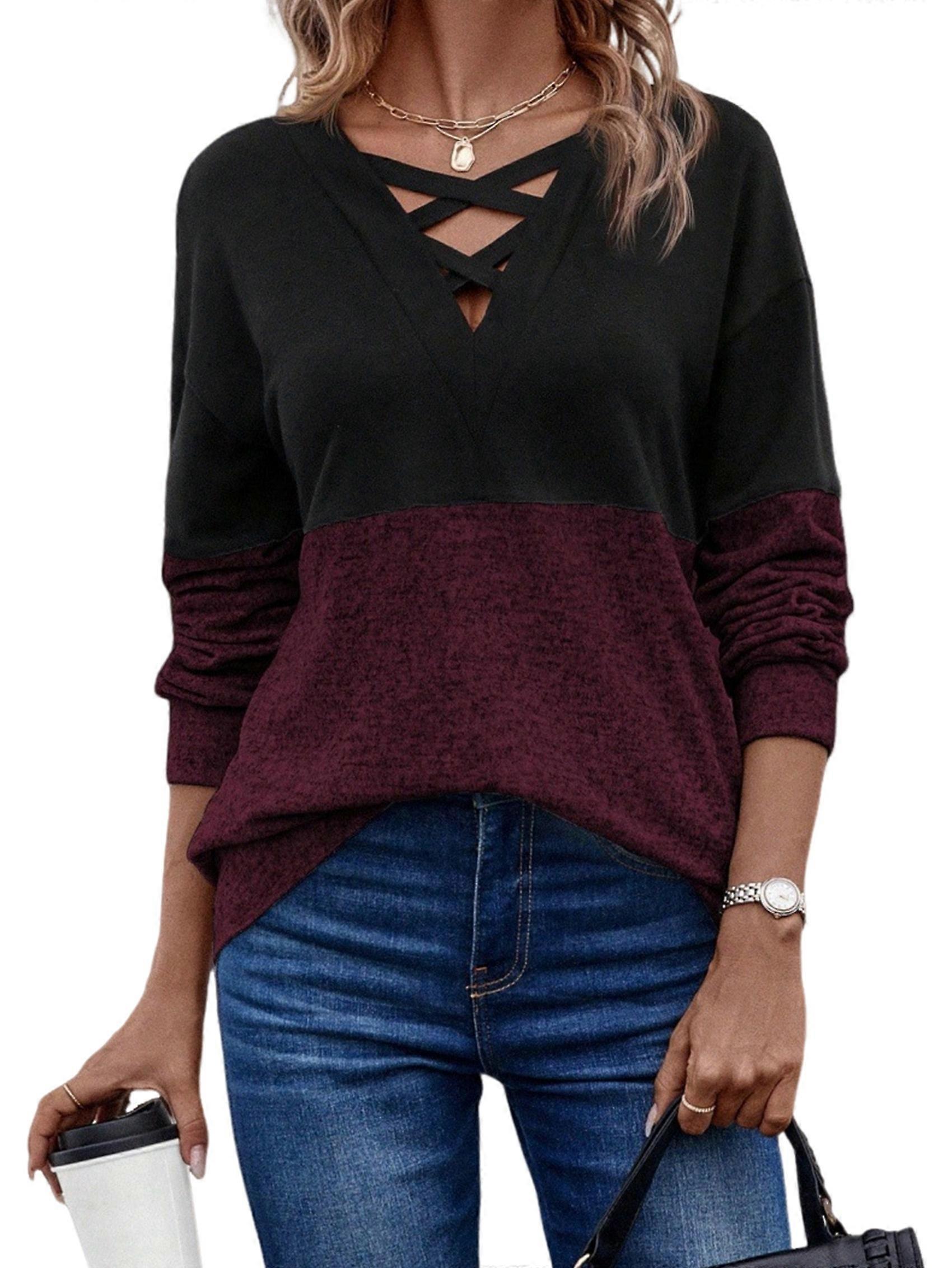 Women'S Sweatshirts Casual Color Block Long Sleeve Tops Trendy Criss V Neck Shirts Wine Red XXL
