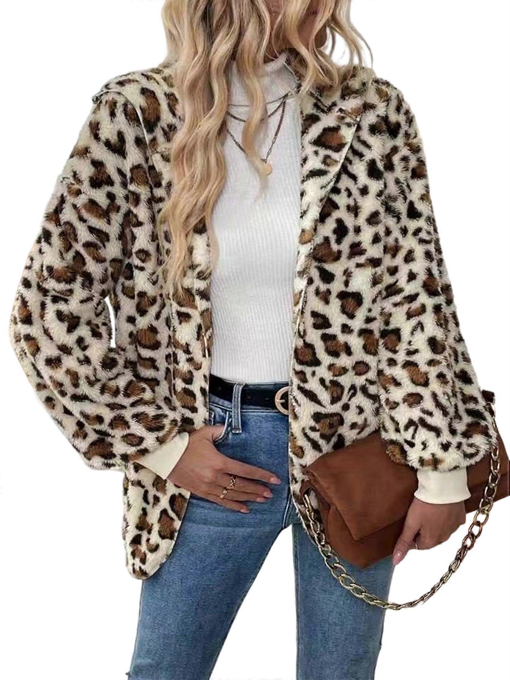 Leopard Print Fuzzy Outerwear Women'S Hooded Long Sleeves Fleece Jacket Ivory White L