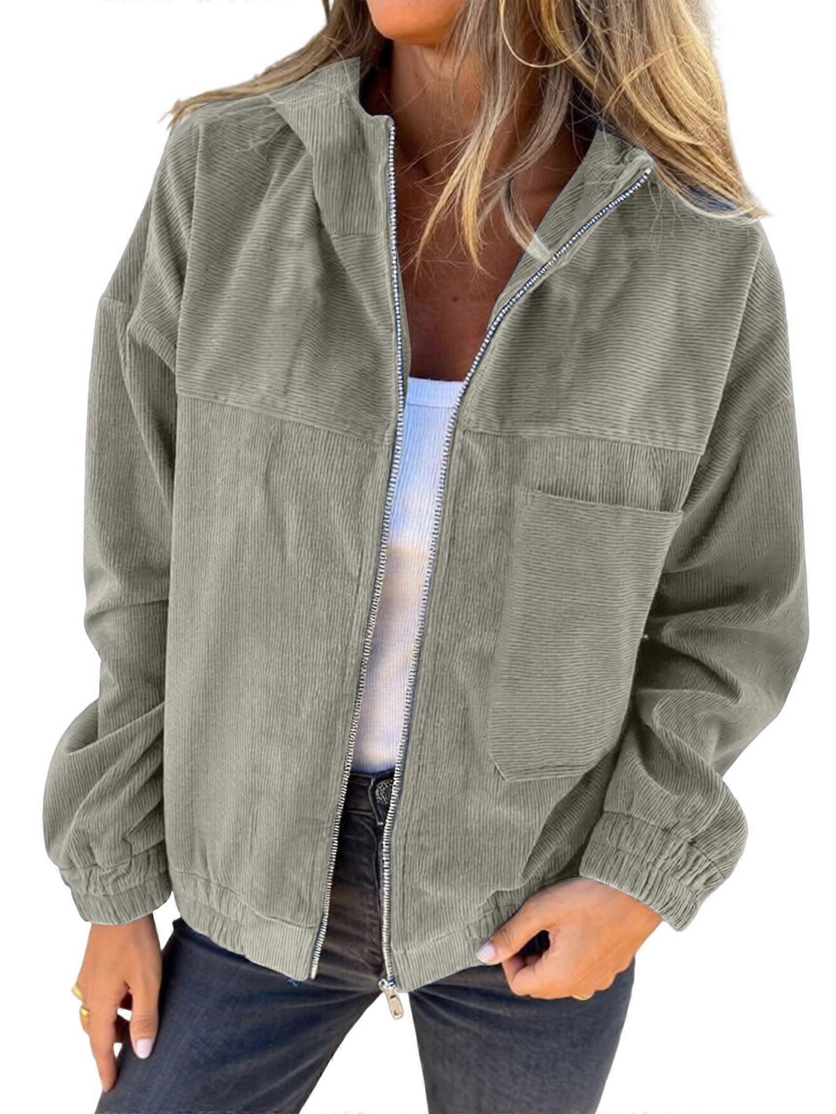 Women'S Solid Color Corduroy Jacket Minimalist Style Hooded Zip Front Coat Casual Outerwear Khaki M