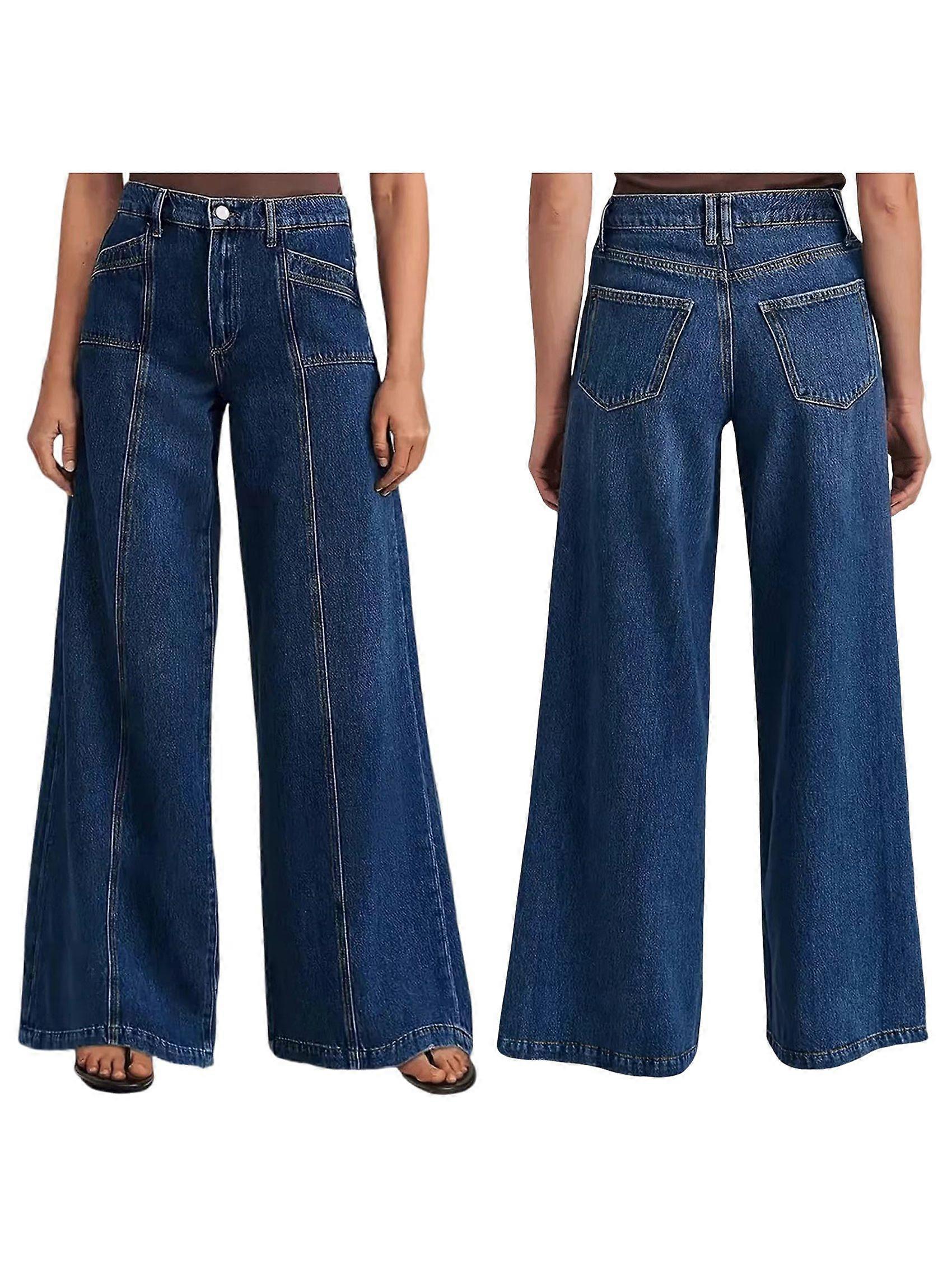 Female Wide Leg Jeans Baggy Jeans Mid Waist Stretch Boyfriend Denim Pants Vintage Trousers with Pocket Deep Blue L