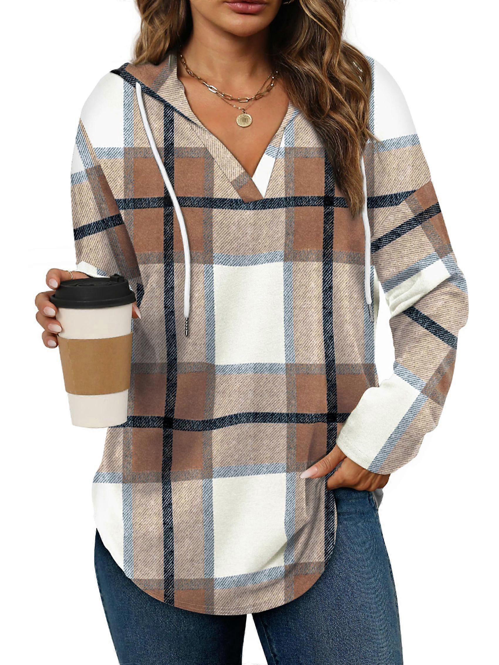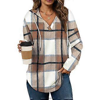 [Plaid]-Please note that the plaid printing is random position, due to different lighting problems, there may be some differences with the picture effect, you can refer to the buyer's comments and opinions when purchasing. [Occasion]- Suitable for casual, party, work, date, school, sports, vacation, streetwear or casual everyday wear, it's a great gift idea for holidays. You can go with almost anything for any occasion. [Very in Style Design]- Very feminine, long-sleeved shirt! V neck design makes you more fashionable and charming. The back of the shirt is longer than the front cover butt, so it looks nice with leggings or jeans. [Perfect Piece for Your Wardrobe]- V neck and loose style makes you look more generous and could hide your belly perfectly! Casual hoodie, We have used high-quality color & fabric an essential closet staple. Moreover, hoodies are the trend of today, and therefore these hoodies ensure a high style quotient while letting you be comfortable. [Garment Care and Size Note]- Hand wash or machine wash in a laundry bag and cold water. Lay dry can keep your clothes in shape. Do not bleach. Please attention to the size chart in the product description, select the size according to it. Size: L=US8=UK12=EU40(cm / inch) Bust: 116.0 / 45.67, Sleeve: 53.0 / 20.87, Length: 78.0 / 30.71, Shoulder: 63.0 / 24.80 Colour: Khaki Material: 65% Polyester, 35% Cotton Package Contents: 1*Women's hooded pullover Only the above package content, other products are not included. Note: Light reflection and different displays may cause the color of the item in the picture a little different from the real thing. The measurement allowed error is +/- 1-3cm.