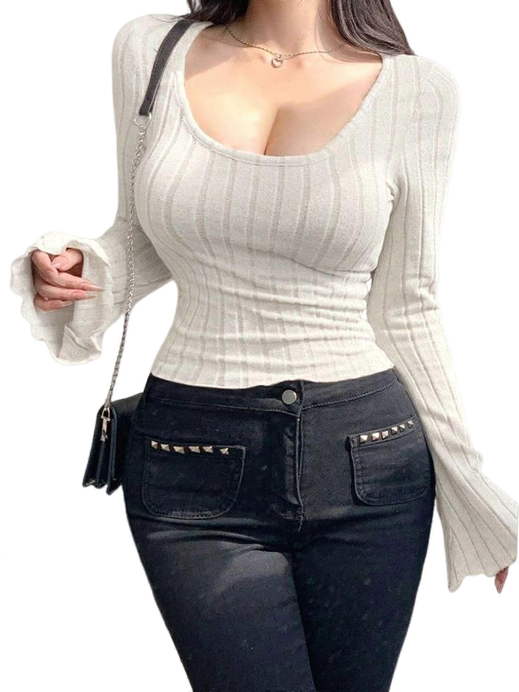 Women'S Long Sleeve Tops, Scoop Neck Ribbed Knit Shirt Slim Fit Pullover Sweater Basic Thermal Shirt Ivory White XXL