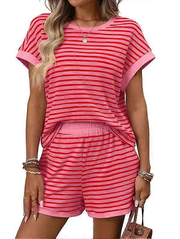 Women'S Summer 2 Piece Sets Striped Short Sleeve T Shirts and Shorts Loungewear Matching Set Deep Pink XL