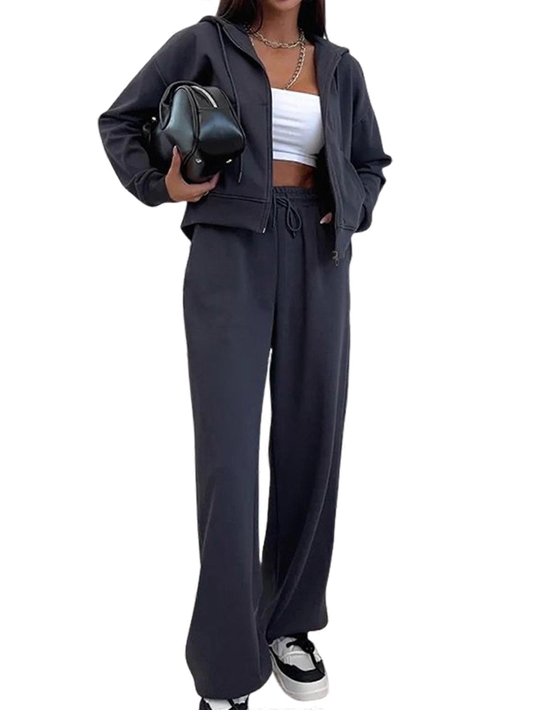Female 2 Piece Outfits Hoodie Zipper Sweatshirt Wide Leg Pants Matching Tracksuit Sets Dark Gray L