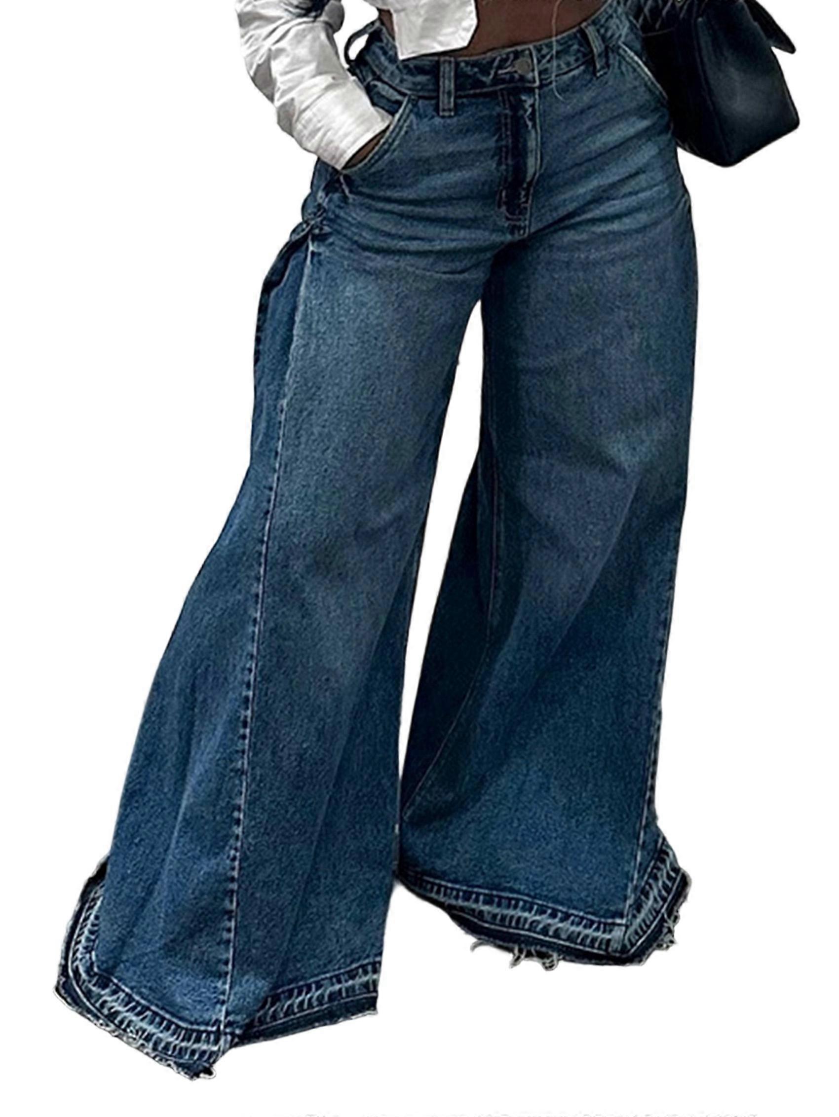 Female Bell Bottom Jeans High Waist Stretch Wide Leg Baggy Flared Pleated Vintage Casual Loose Denim Pants Blue S