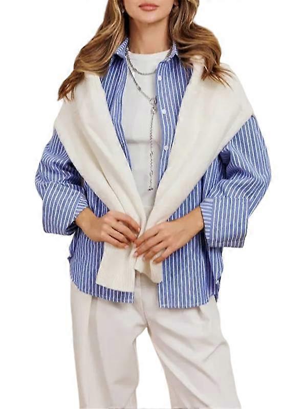 Featuring a button up front, collared neck, oversized shirt, curved hem, old money style, this striped dress shirt combines functionality with a classic regular fit cut, showcasing your fashion and charm. The long sleeve womens button down shirt is suitable for all seasons.These stripe blouses for women fashion can be rolled up for a cool laid back style, casual long sleeve button down shirts make you look more chic, stylish. Our stylish button down shirts for women are a casual must-have. Pair button up shirt women with jeans, shorts, skirts, or tank tops for a casual look, or with blazers, trousers, and heels for a stylish and elegant ensemble. Ideal for office, work, business meetings, casual outings, beach holidays, and parties. This dress shirts for women can be worn alone or as a jacket, making it a versatile addition to your wardrobe. Size: S=US4=UK8=EU36(cm / inch) Bust: 104.0 / 40.94, Sleeve: 54.0 / 21.26, Length: 68.5 / 26.97, Shoulder: 44.0 / 17.32 Colour: Sky Blue Material: 100% Polyester Package Contents: 1 * Shirts Only the above package content, other products are not included. Note: Light reflection and different displays may cause the color of the item in the picture a little different from the real thing. The measurement allowed error is +/- 1-3cm.