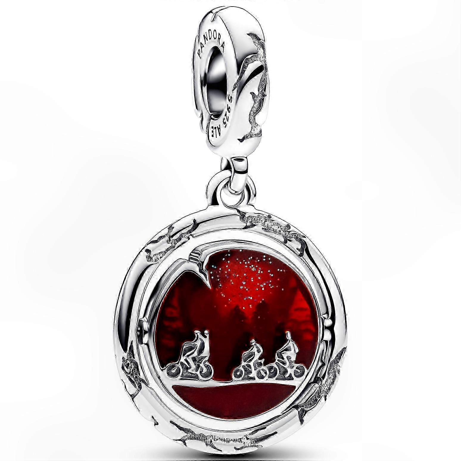 1. Keep your friends and all creatures at bay with our glow-in-the-dark shadow world charm pendant inspired by Stranger Things. 2. This sterling silver spinning charm features glow-in-the-dark enamel and showcases two iconic scenes beloved by fans. 3. One side depicts a group of friends riding their bikes on a mission through Hawkins. 4. The other side shows a creature moving swiftly through the forest.