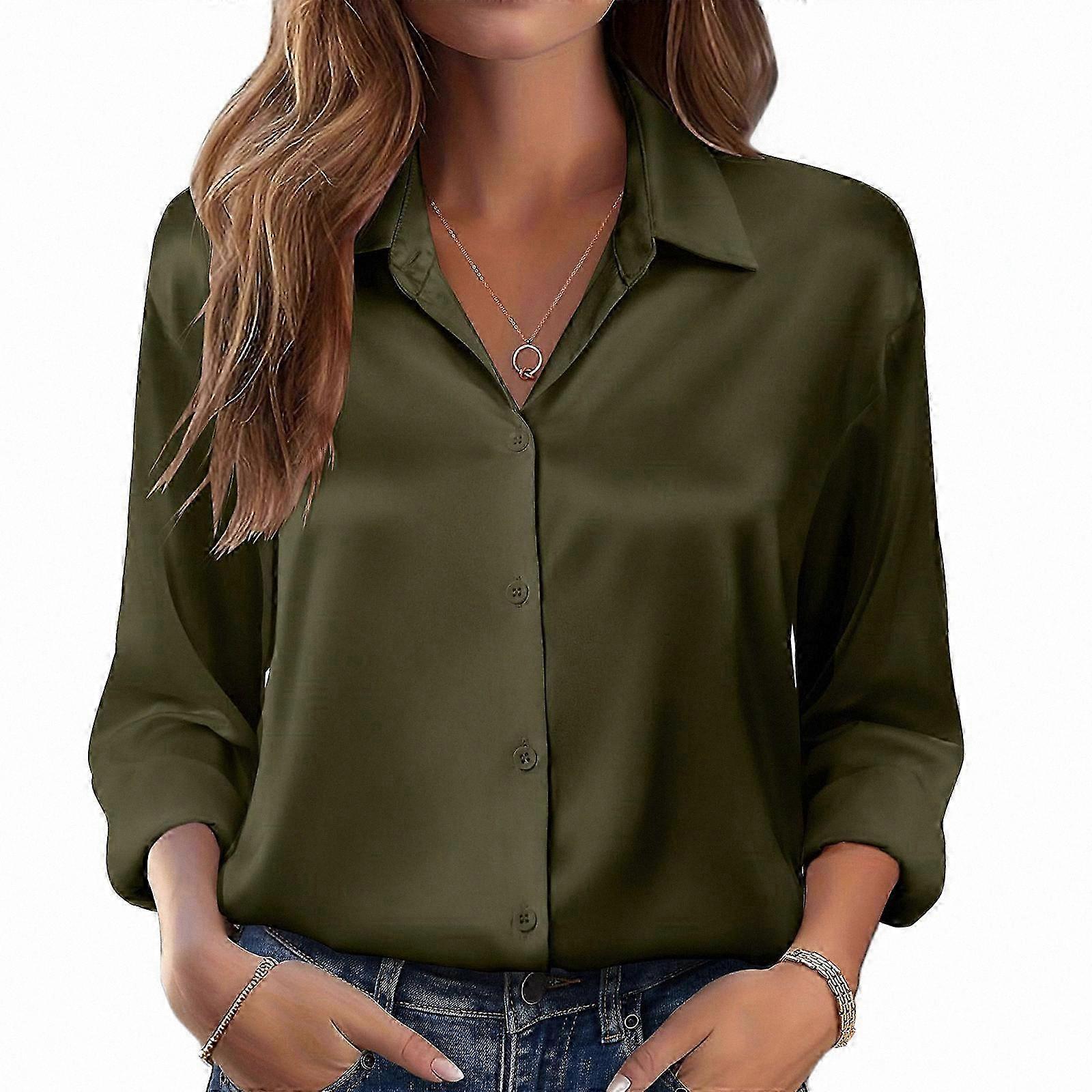 Women's Satin Silk Button-Down Shirt, Long Sleeve Business Casual Top, Dark Brown, Size XL