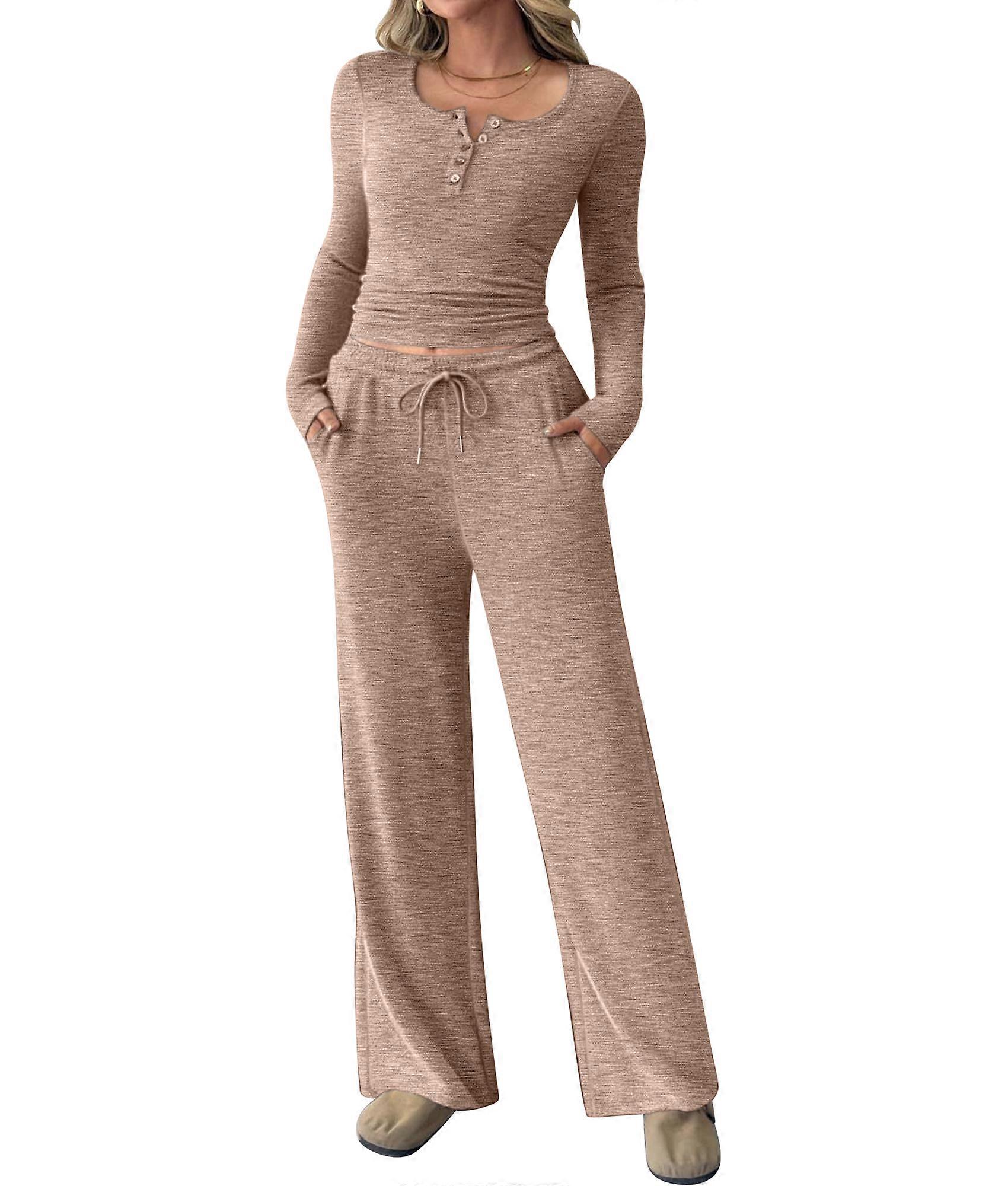 Women'S 2 Piece Matching Lounge Sets Fall Fashion Outfits Henley Neck Sweater Top Wide Leg Pants Sweat Suits Khaki XL