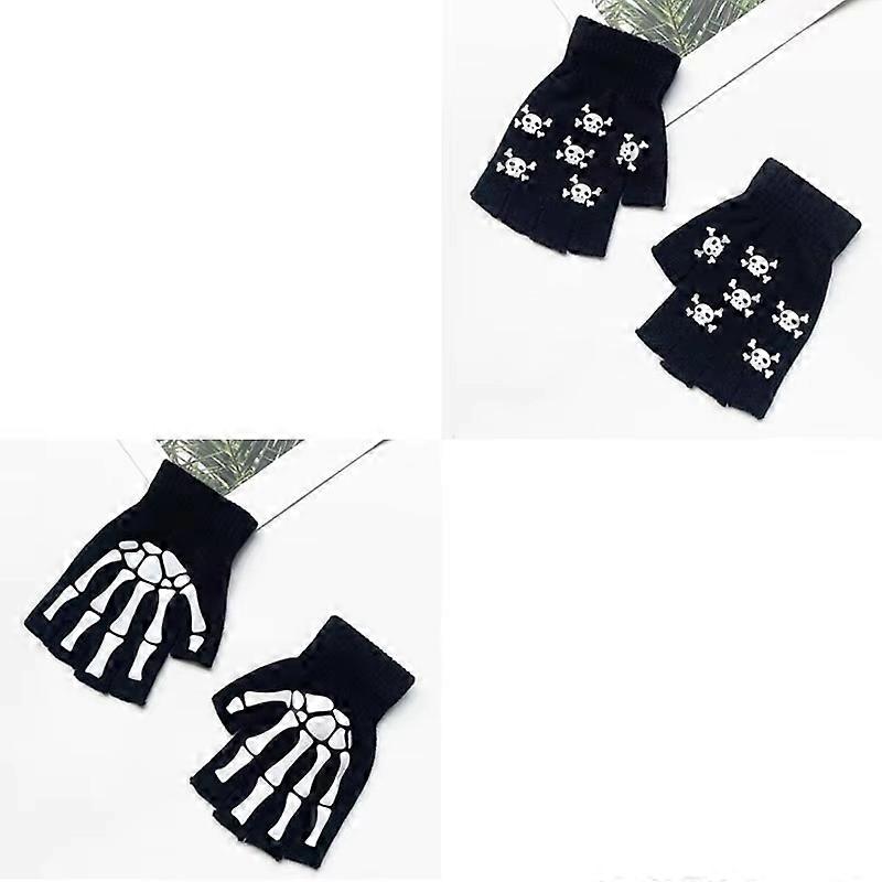 1/2/3pair Halloween Skeleton Skull Gloves Punk Half Finger Gloves Winter Unisex Skull Fingerless Knitted Mitten Glow In The Dark
