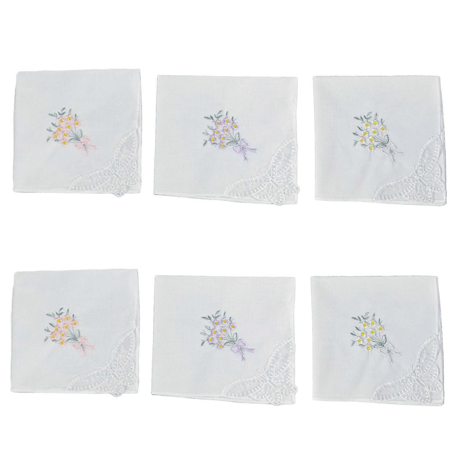 Ladies Elegant Colored Floral Embroidered Handkerchief with Lace Edge Soft Cotton Fabric Hanky Pocket Square Towel Set 6 items