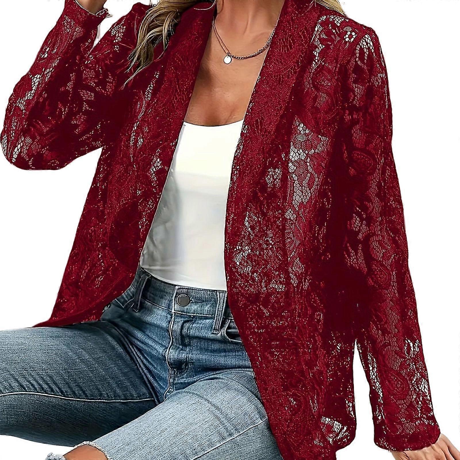 Womens Solid Floral Lace Jacket Open Front Blazers Coat Casual Long Sleeve Lapel Collar Sheer Mesh Cardigan Outerwear Burgundy XL