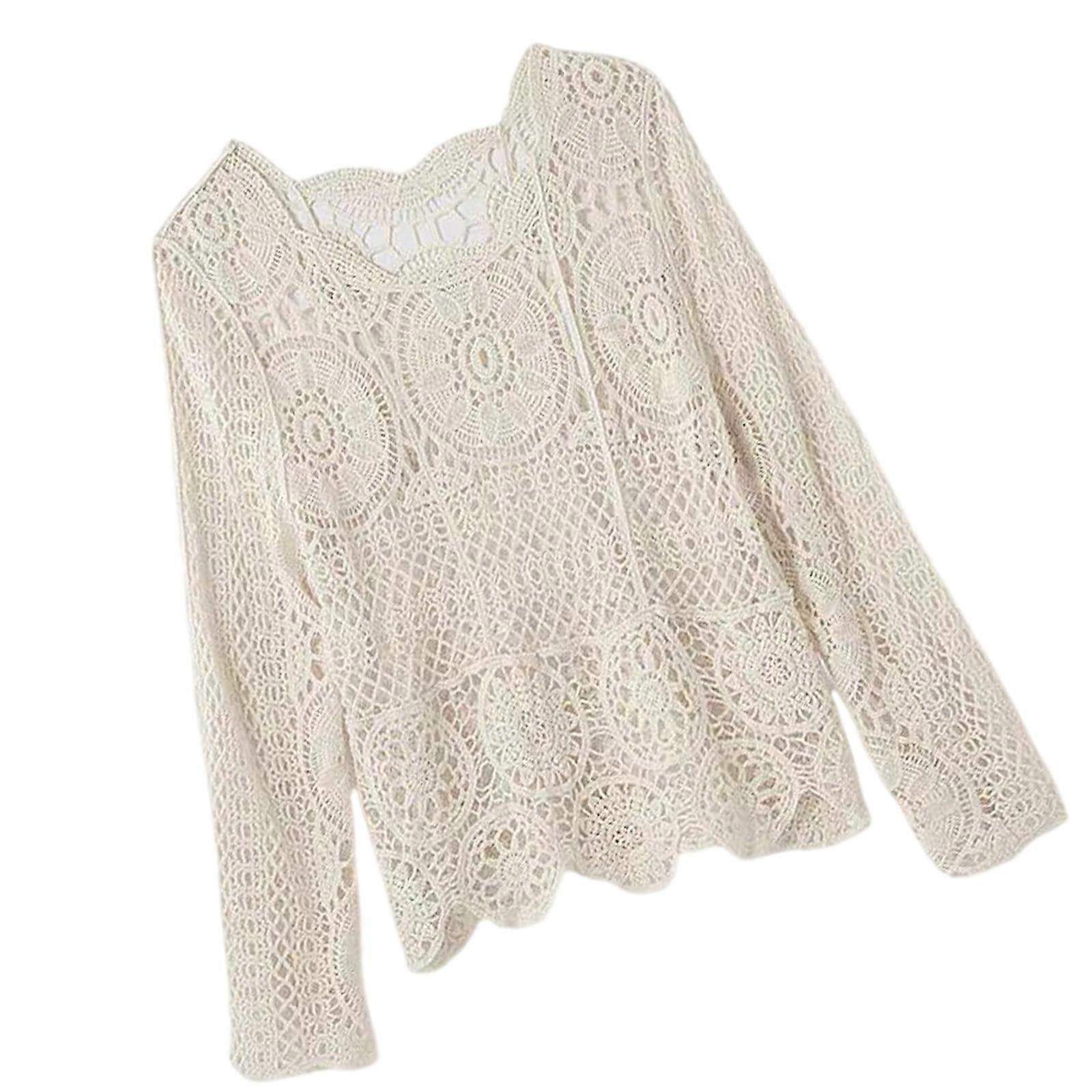 Fashion Cotton Blend Crochet Pullover Top Long Sleeve For Tropical Sun Breathable Long Sleeve Tops Travel Lightweight apricot OS