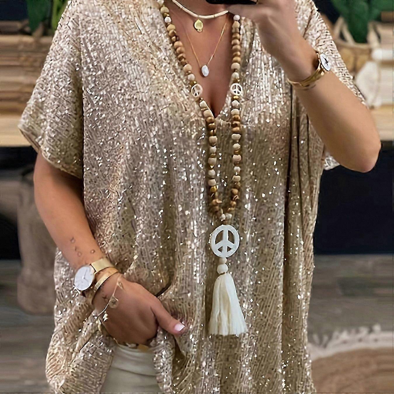 Sequin V-Neck Short Sleeve T-Shirt, Women's Casual Solid Summer Top, Comfortable Everyday Wear SZJG240306