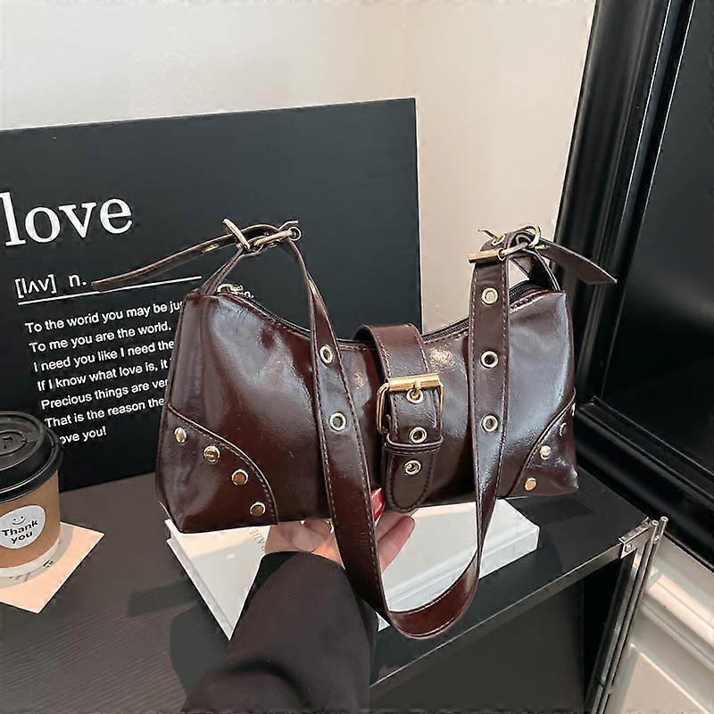 Vintage Patent Leather Underarm Bag Solid Color Studs & Metal Buckle Belt Zipper PU Adjustable Strap Easy Organize for Commute