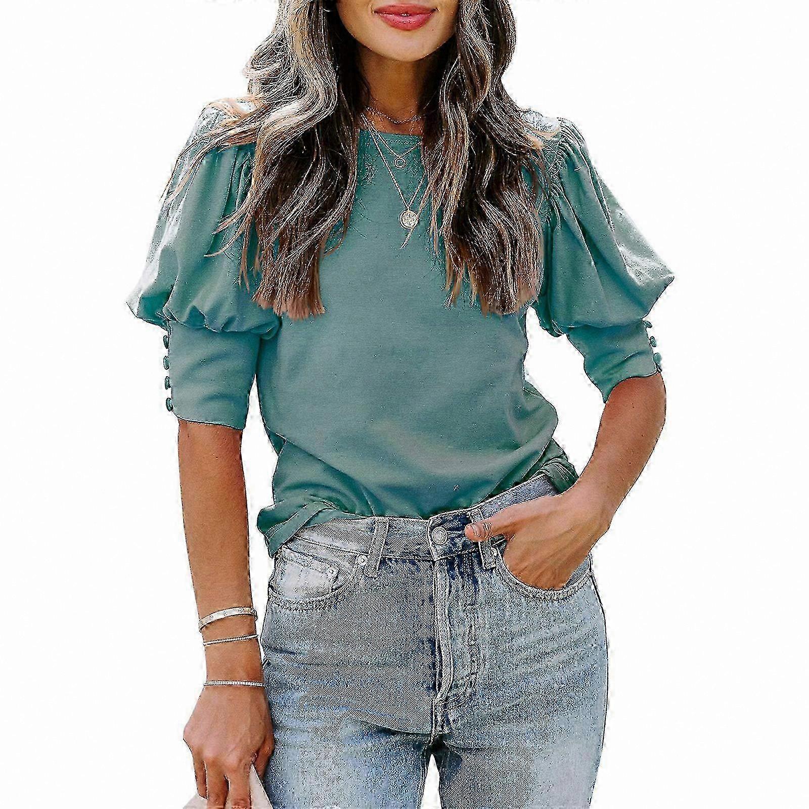 Women's Casual Loose Fit T-Shirt with Button Cuffs, Half Puff Sleeves & Crew Neck - Apricot Color