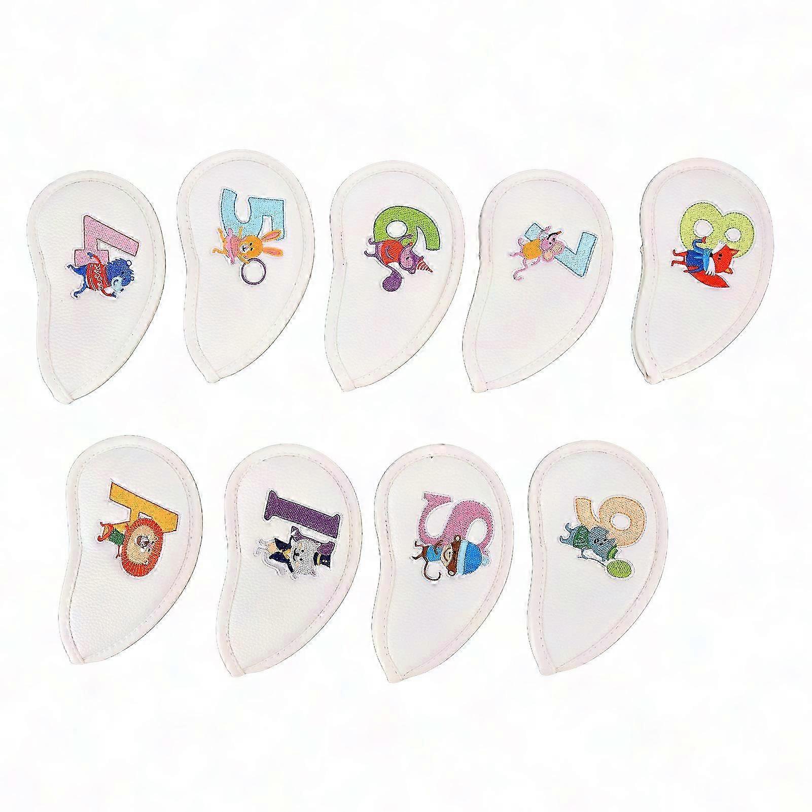 9pcs Golf Iron Head Covers, PU Leather with Cartoon Animal Embroidery, White