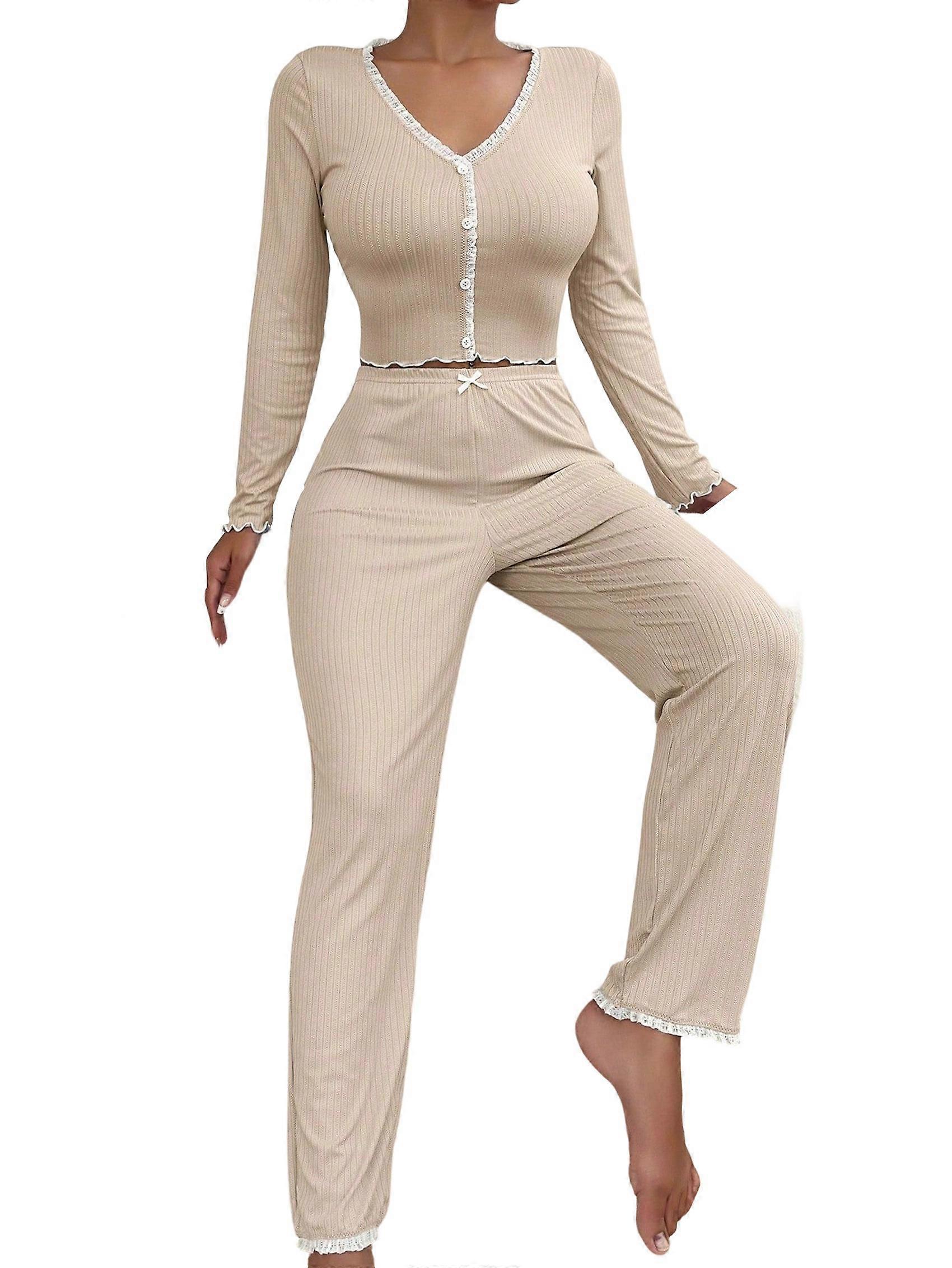 Womens Cute Long Sleeve Pajama Set Ribbed Top and Pants Sleepwear 2 Piece Pjs Khaki S