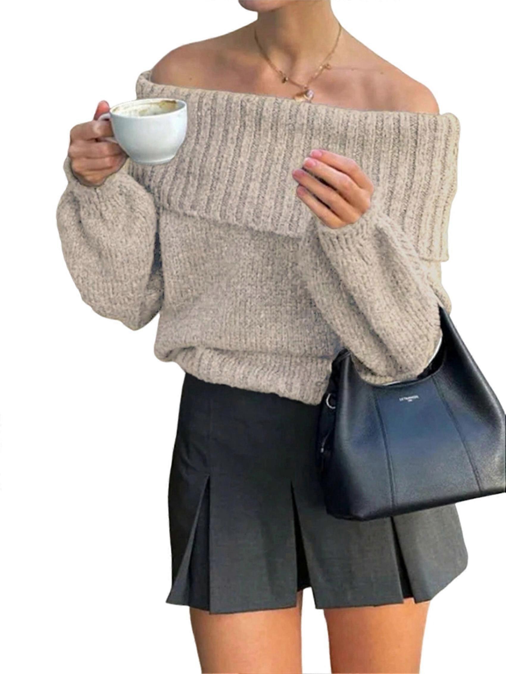 Female Sweaters Off the Shoulder Long Sleeve Cable Knit Sweater Loose Chunky Pullover Dressy Work Tops Khaki L