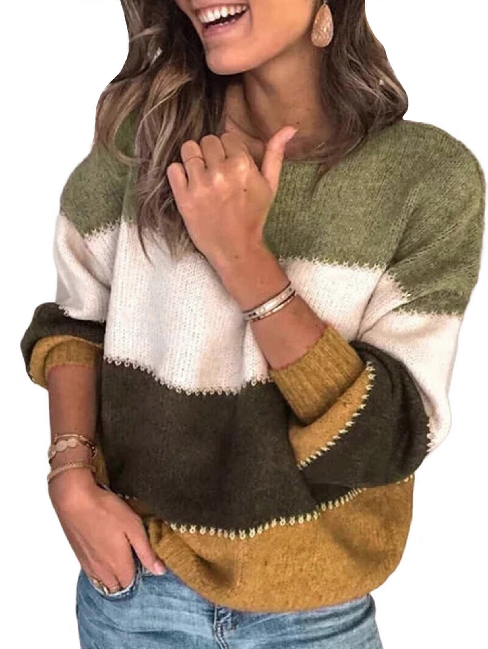 Female Sweaters Casual Long Sleeve Crewneck Color Block Patchwork Pullover Knit Sweater Tops Yellow S