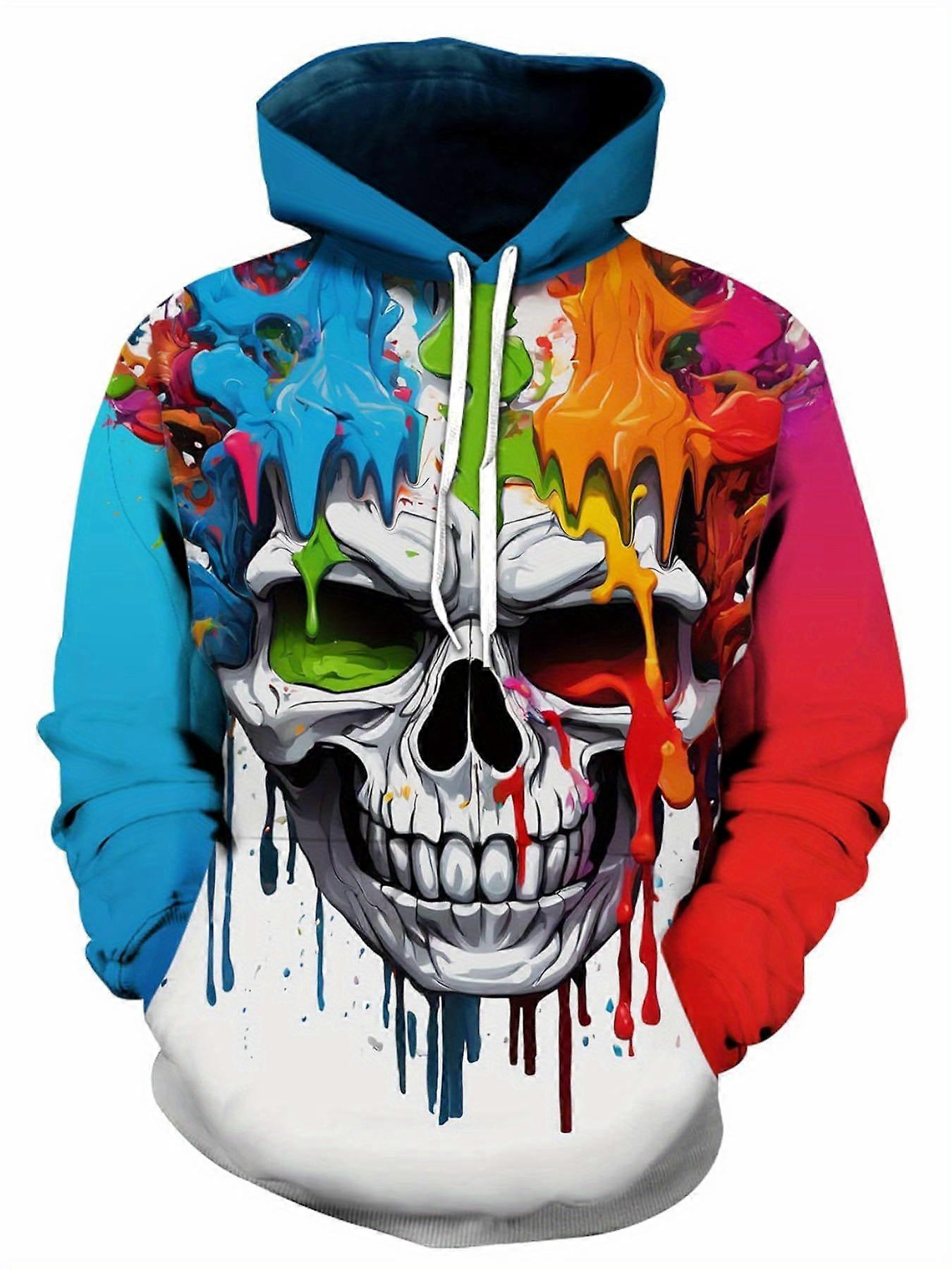 Men’s Vibrant Graphic Hoodie Paint Drip Skull Print Casual Streetwear Pullover