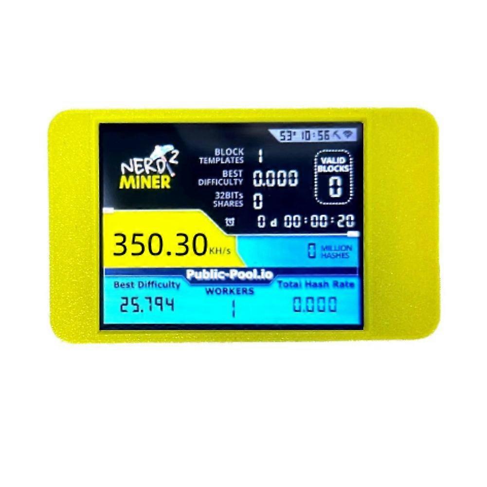 Smart Bitcoin Mining Display: Equipped with a clear 2.8-inch smart color display, it shows real-time hash rate, share statistics, mining status, and mining pool information at a glance. Intuitive visual feedback makes it easy for both beginners and enthusiasts to monitor performance.Cryptocurrency Solo Mining and Lottery-Style Mining Modes: Supports both solo mining and lottery-style mining modes for cryptocurrencies, simulating real Bitcoin mining behavior. Users can participate in mining like a lottery, experiencing the process of block discovery and reward probability without investing in large, power-hungry hardware.Low Power Consumption and Silent Operation: Much lower power consumption than traditional ASIC miners, suitable for long-term operation in office or bedroom environments. Its virtually silent operation makes it an excellent demonstration device for classrooms and presentations.Easy Setup and User-Friendly Interface: Simple wiring and clear on-screen menus allow you to start mining in just a few steps. No complex assembly is required, and the graphical interface helps you easily configure Wi-Fi, mining pool settings, and display options.Upgraded 350k/s Hash Rate: Provides a hash rate of approximately 350k/s, ideal for educational and experimental mining scenarios. It provides a realistic platform to help users understand concepts such as Bitcoin mining mechanisms, block discovery, and hash rate.Color: YellowMaterial: plasticPackage Contents:1*BTC Solo Miner1*Data Cable (color random)1*Stylus Pen (color random)Only the above package content, other products are not included.Note: Light reflection and different displays may cause the color of the item in the picture a little different from the real thing. The measurement allowed error is +/- 1-3cm.