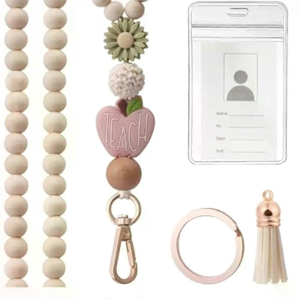 1 Set Fashion Wood Beaded Lanyard with ID Holder Pink Daisy Beads ID Holder Strap with Tassel String for ID Badges Women