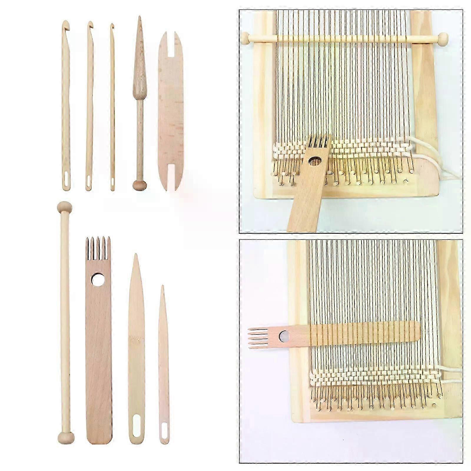 A 9-piece weaving tool set, including a wooden shuttle, crochet hook, hand-knitting sticks, and tapestry weaving DIY craft tools.
