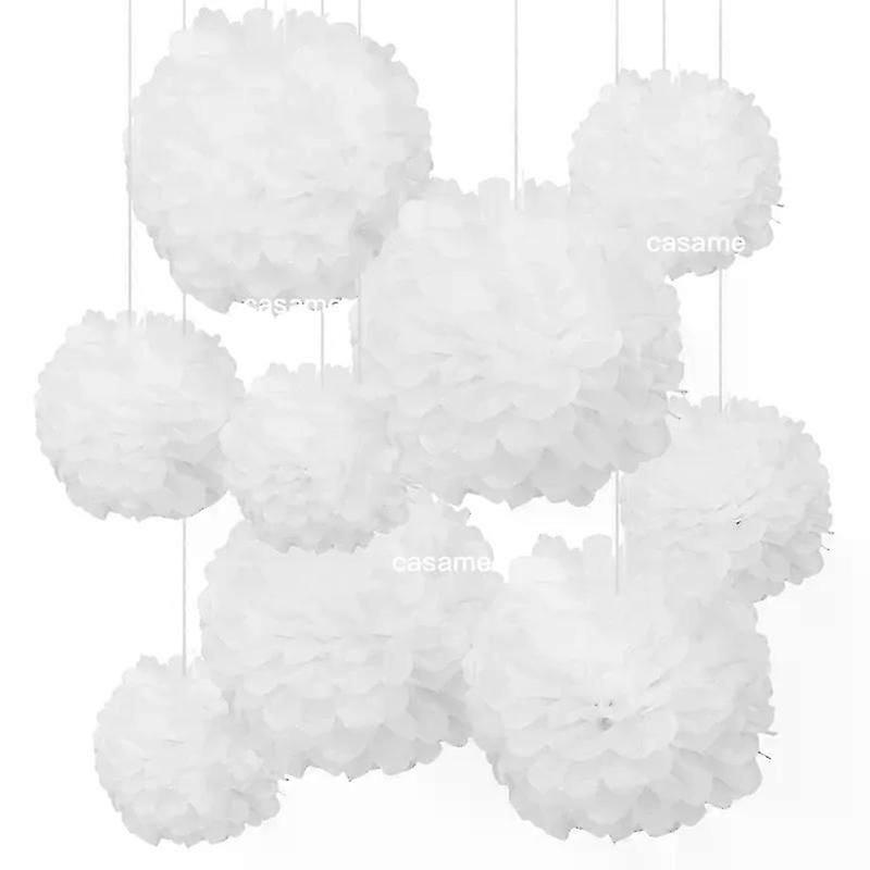 Nine white tissue paper pom-pom flower wall decorations with ribbon, suitable for botanical-themed neutral baby parties and weddings.