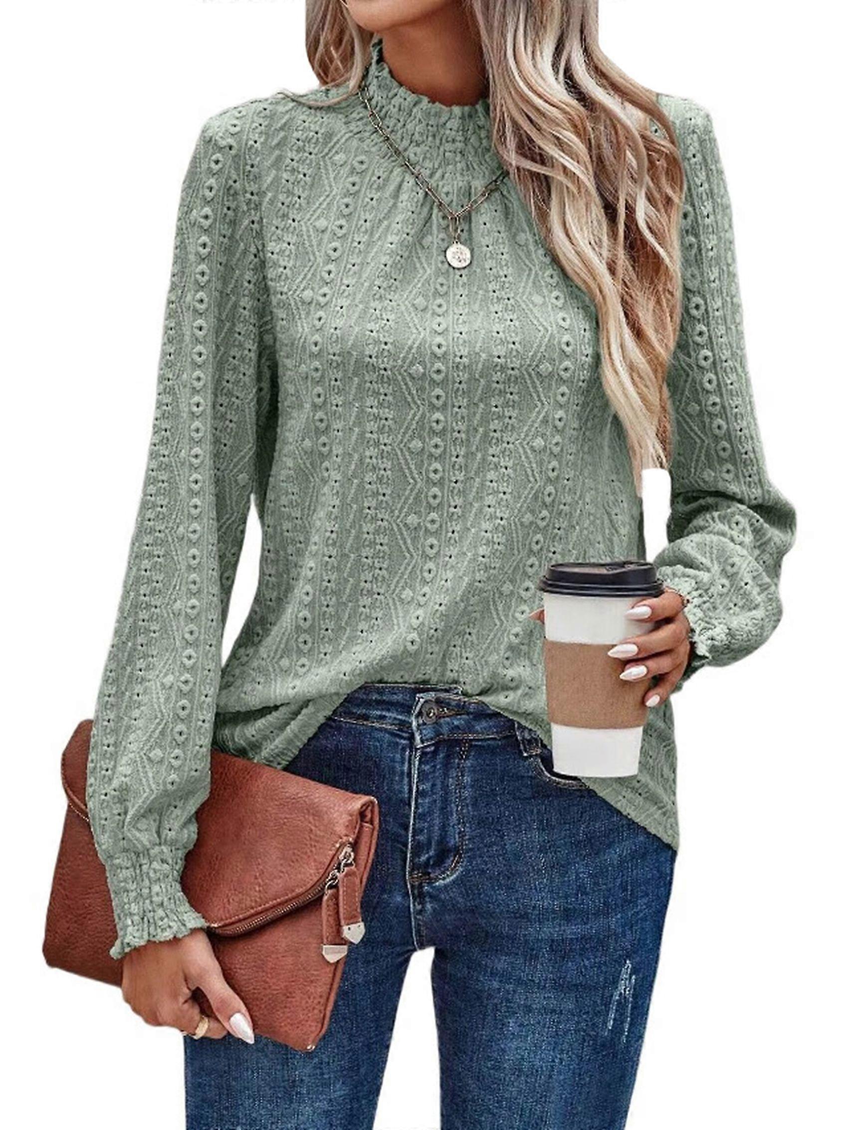 Women'S Lace Eyelet Blouse Frill Mock Neck Vintage Top Lantern Long Sleeve Elegant Tops Green L