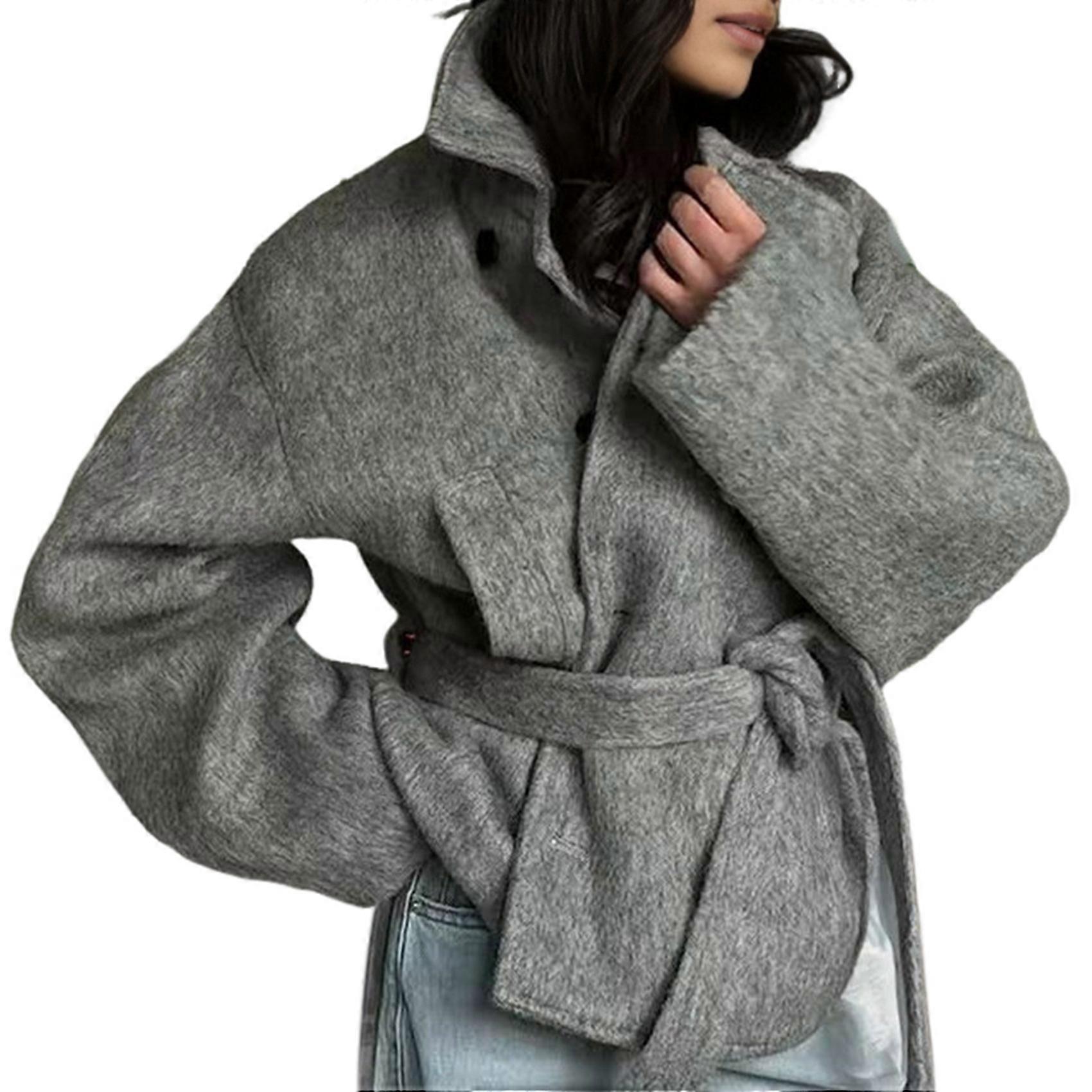 Female Wool Blend Pea Coat Lapel Double Breasted Winter Loose Short Button Belt Outerwear Jacket Light Gray L