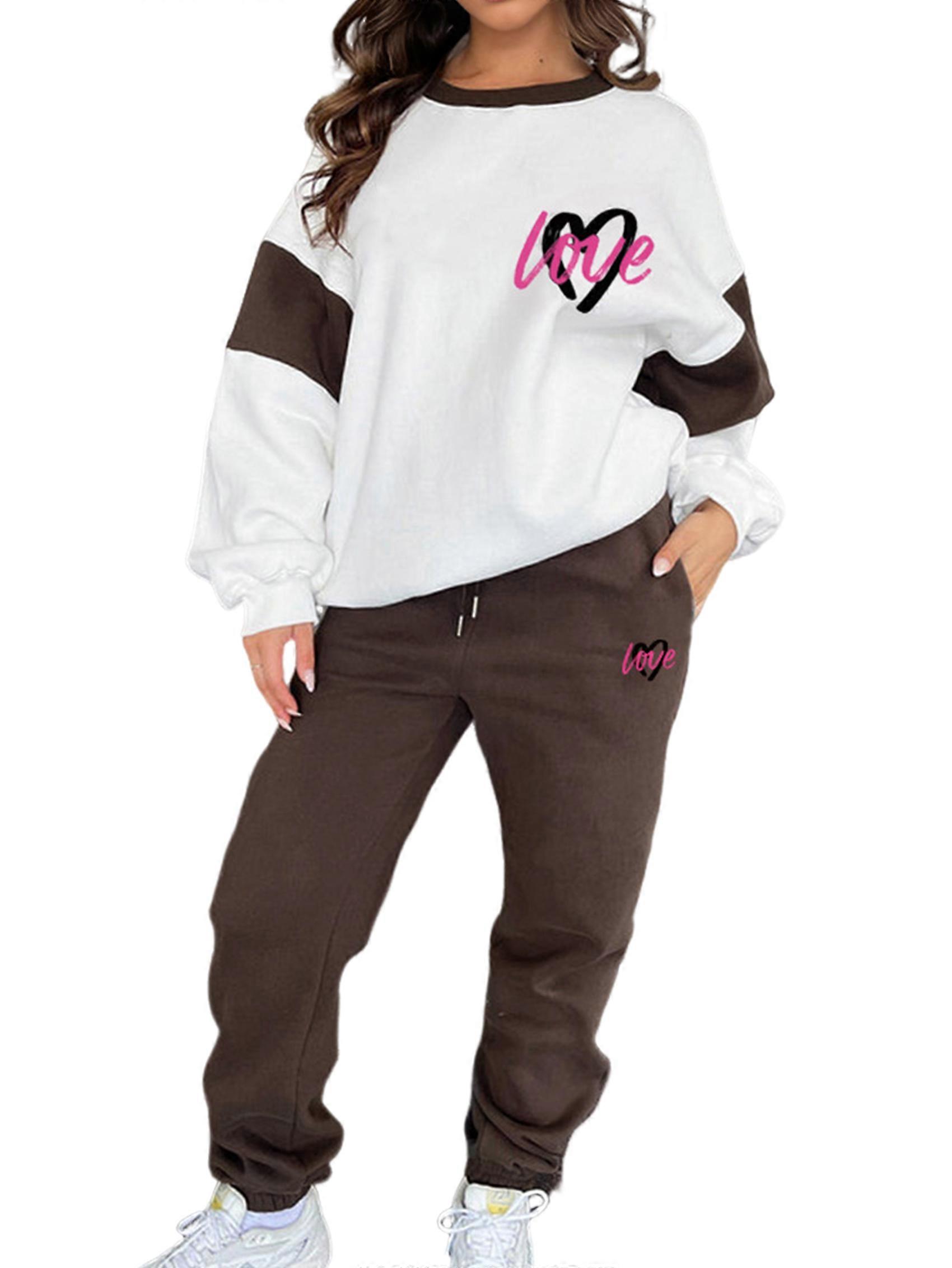 Sweatsuits for Women 2 Piece Heart Print Color Block Sweatshirt Fashion Casual Crewneck Lounge Sets Brown S