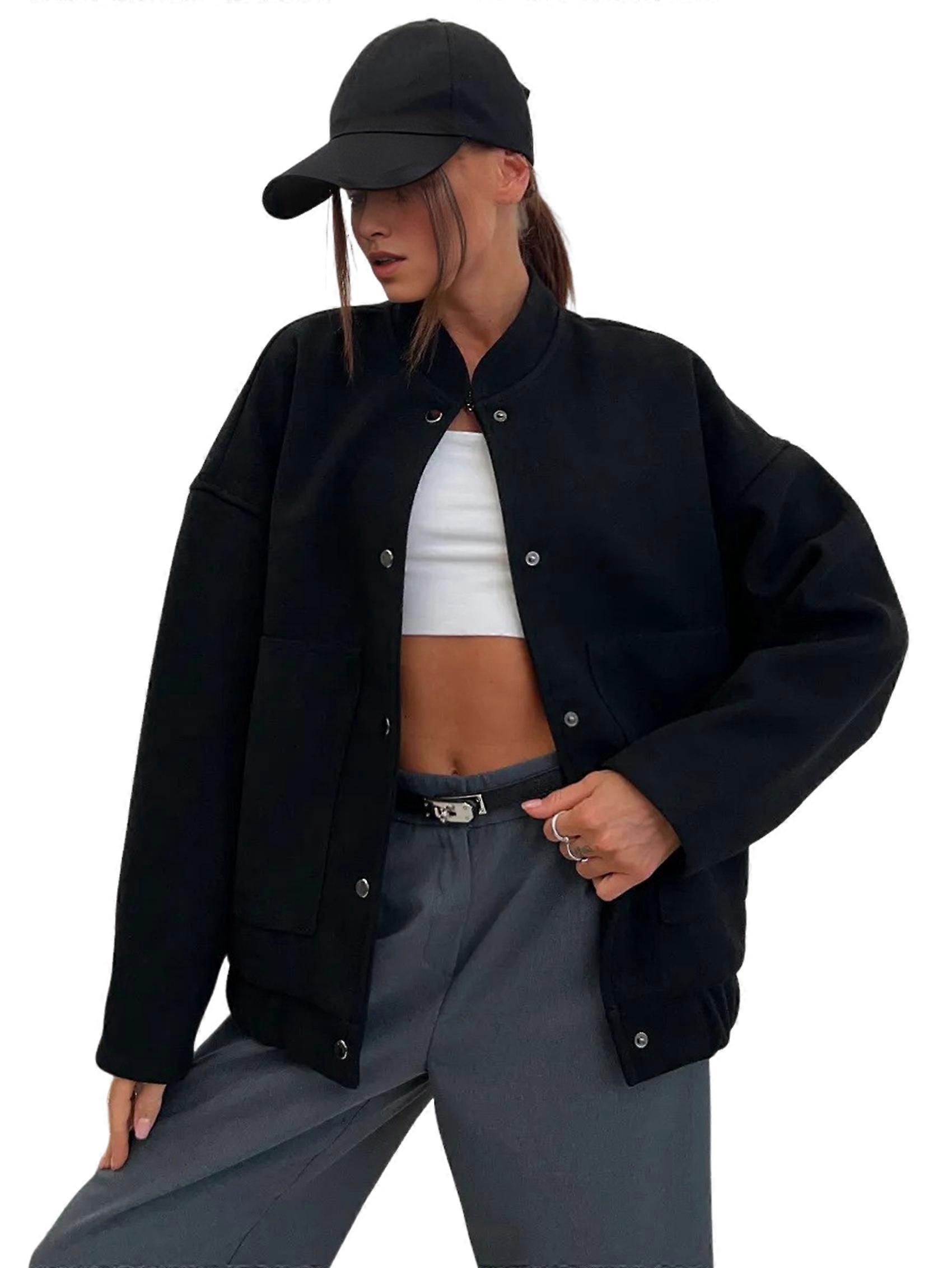 Women'S Button Up Jackets Jackets Long Sleeve Open Front Jackets Pockets Winter Casual Trendy Varsity Jacket Black M