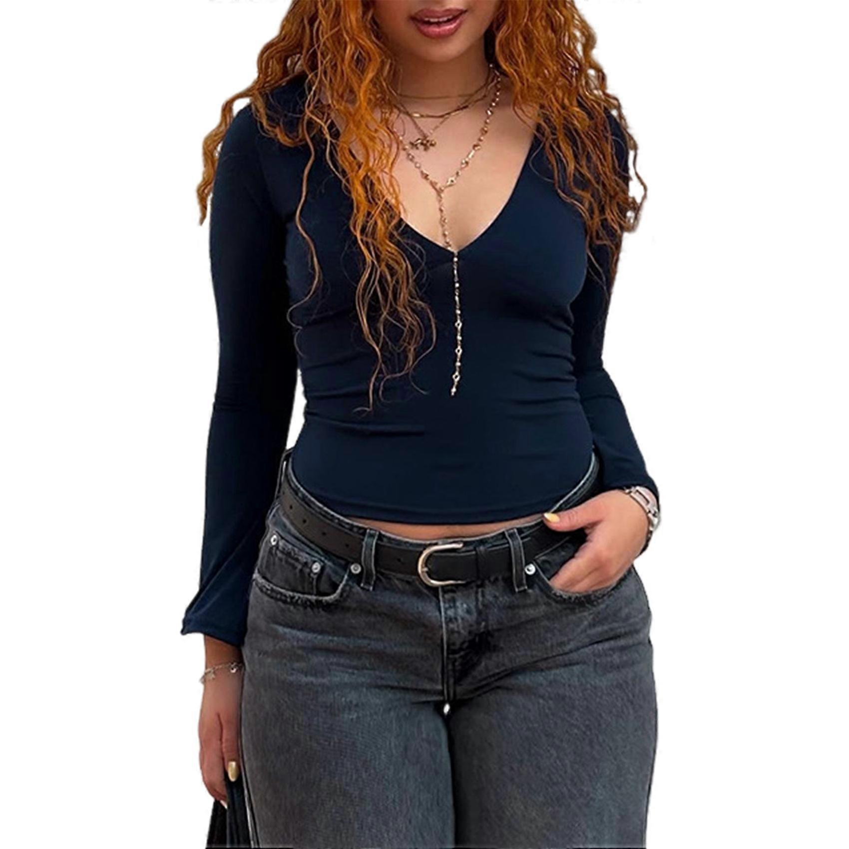 Women'S Wrap Ruched Plunge Deep V Neck Slim Fit Long Sleeve T Shirt Tunic Tops Tee Deep Blue S