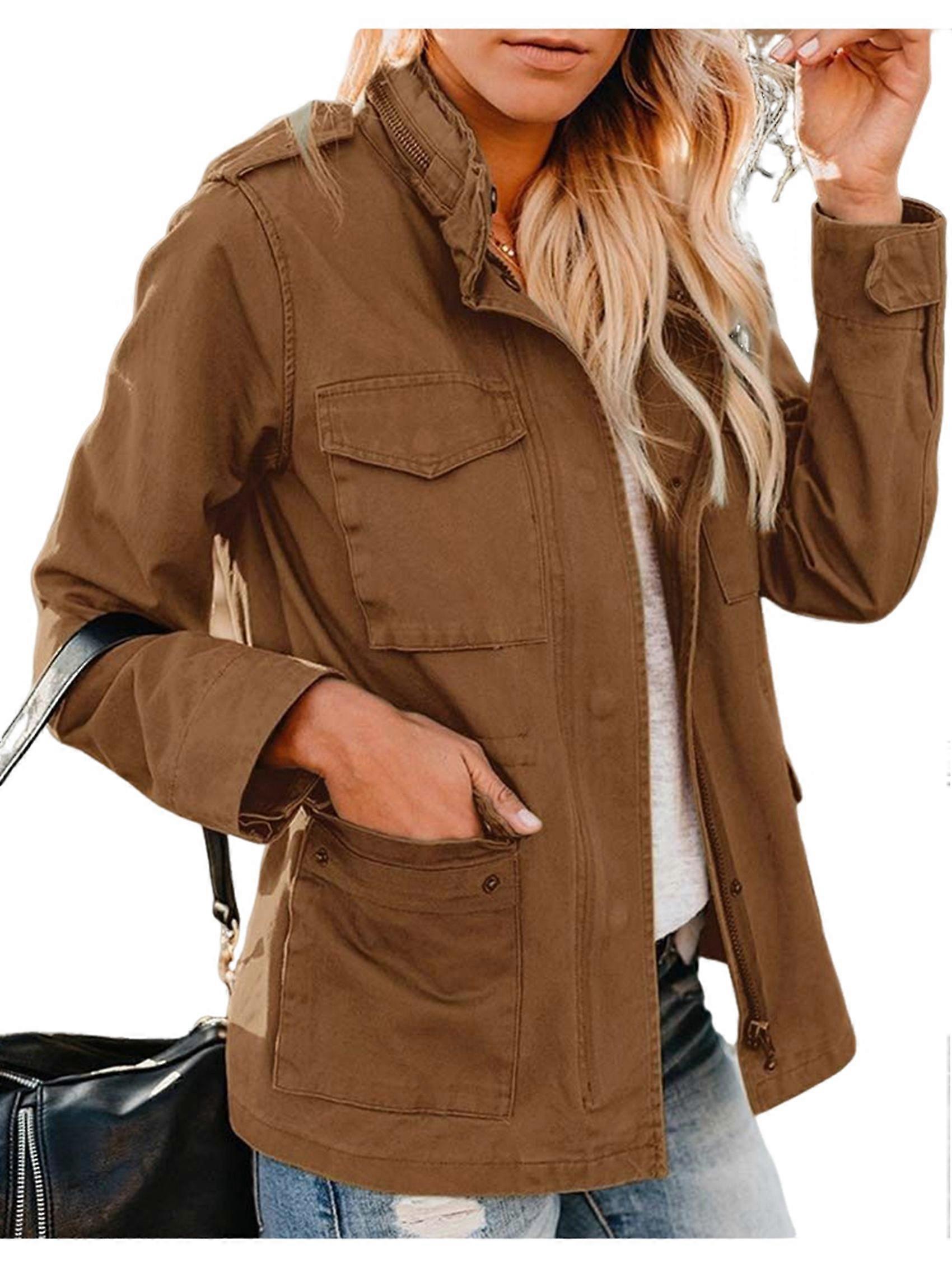 Women Anorak Jackets Zip Up Snap Buttons Parka Utility Coats Outwear with Pocket Brown L