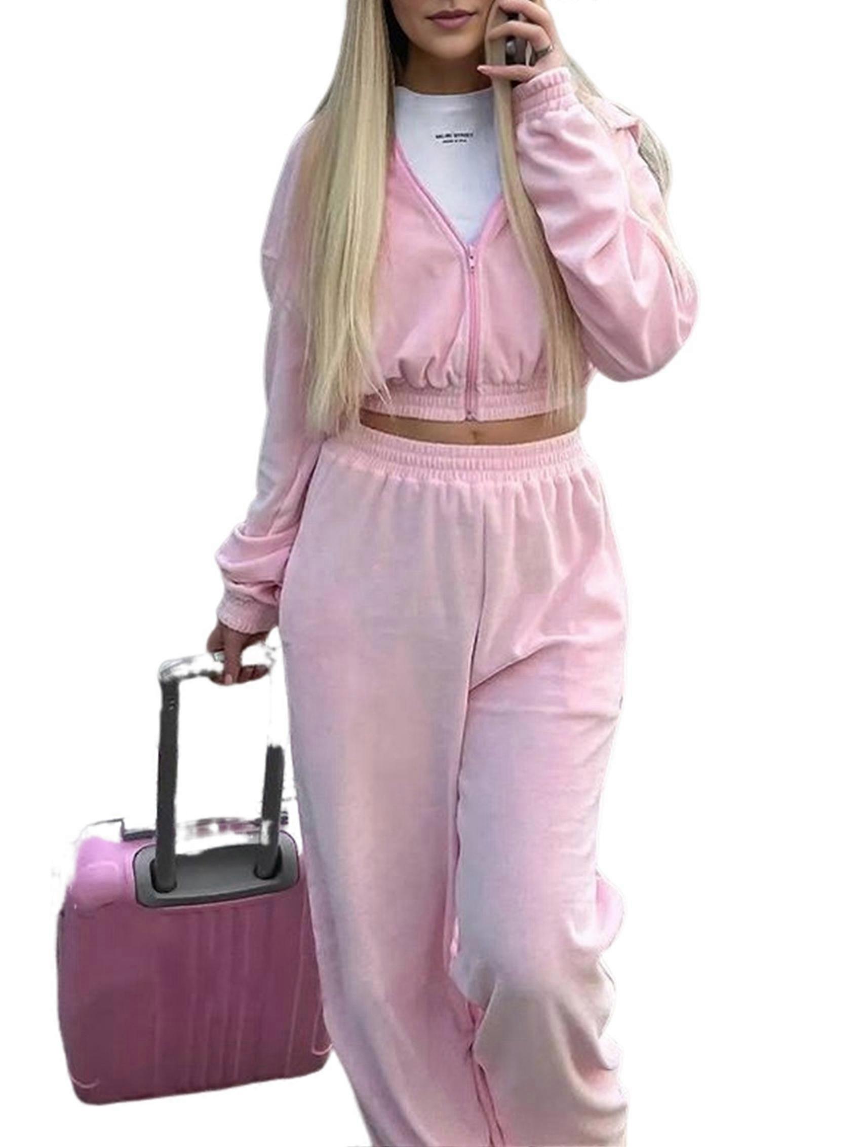 Women'S Full Zip Hooded Sweatshirt Wide Leg Pants Two-Piece Set, Casual Jogging Suit, Fitness Cardigan Set Pink L