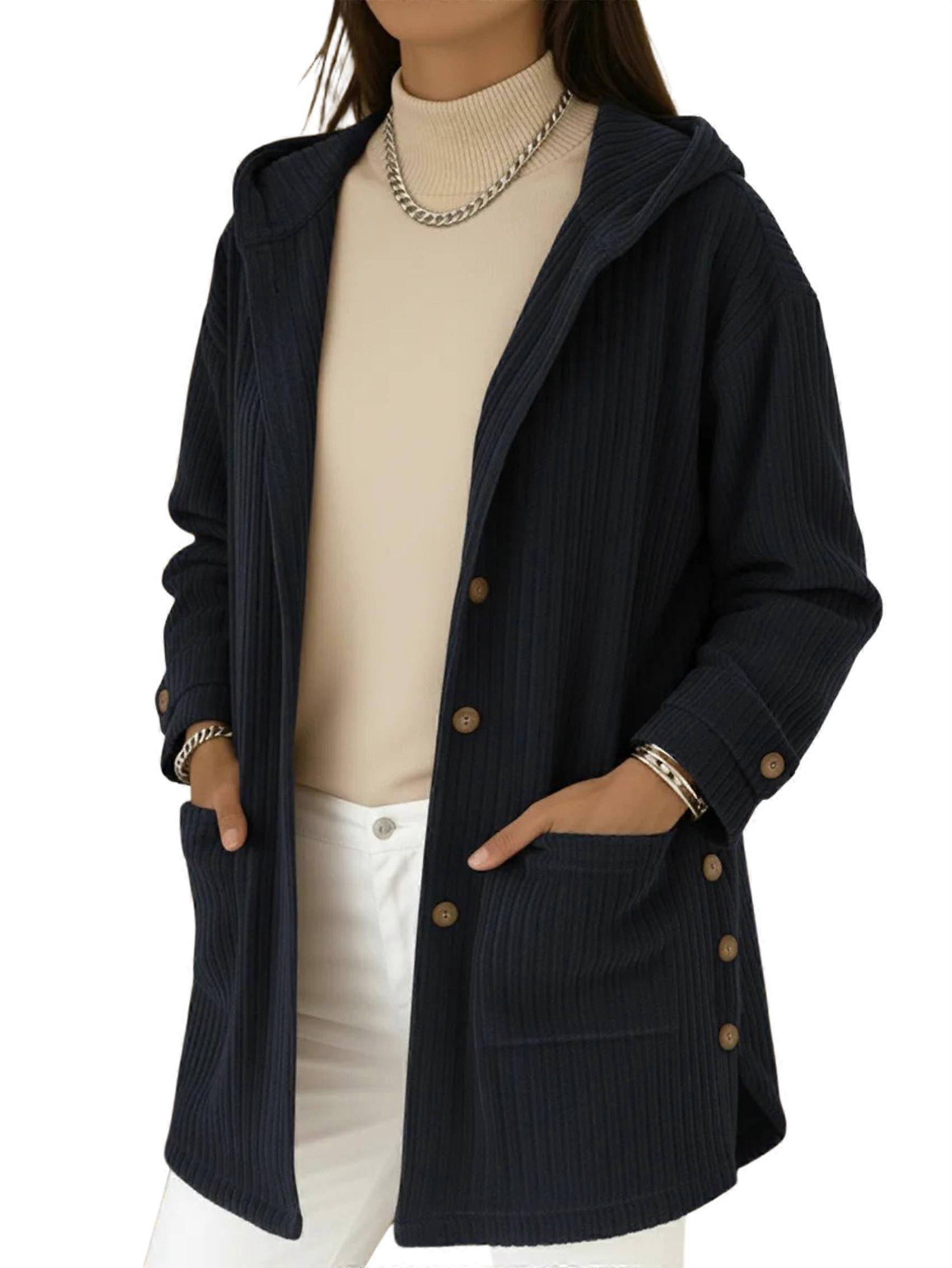 Womens Long Sleeve Corduroy Jacket Fall Button Up Hooded Coat with Pocket Trendy Loose Fit Sweatshirt Coats Navy Blue XL
