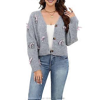 Women'S Elegant Solid Color Knit Cardigan Bo-W Embellishments, Soft, Warm, & Stylish Fall/Winter Sweater Gray S