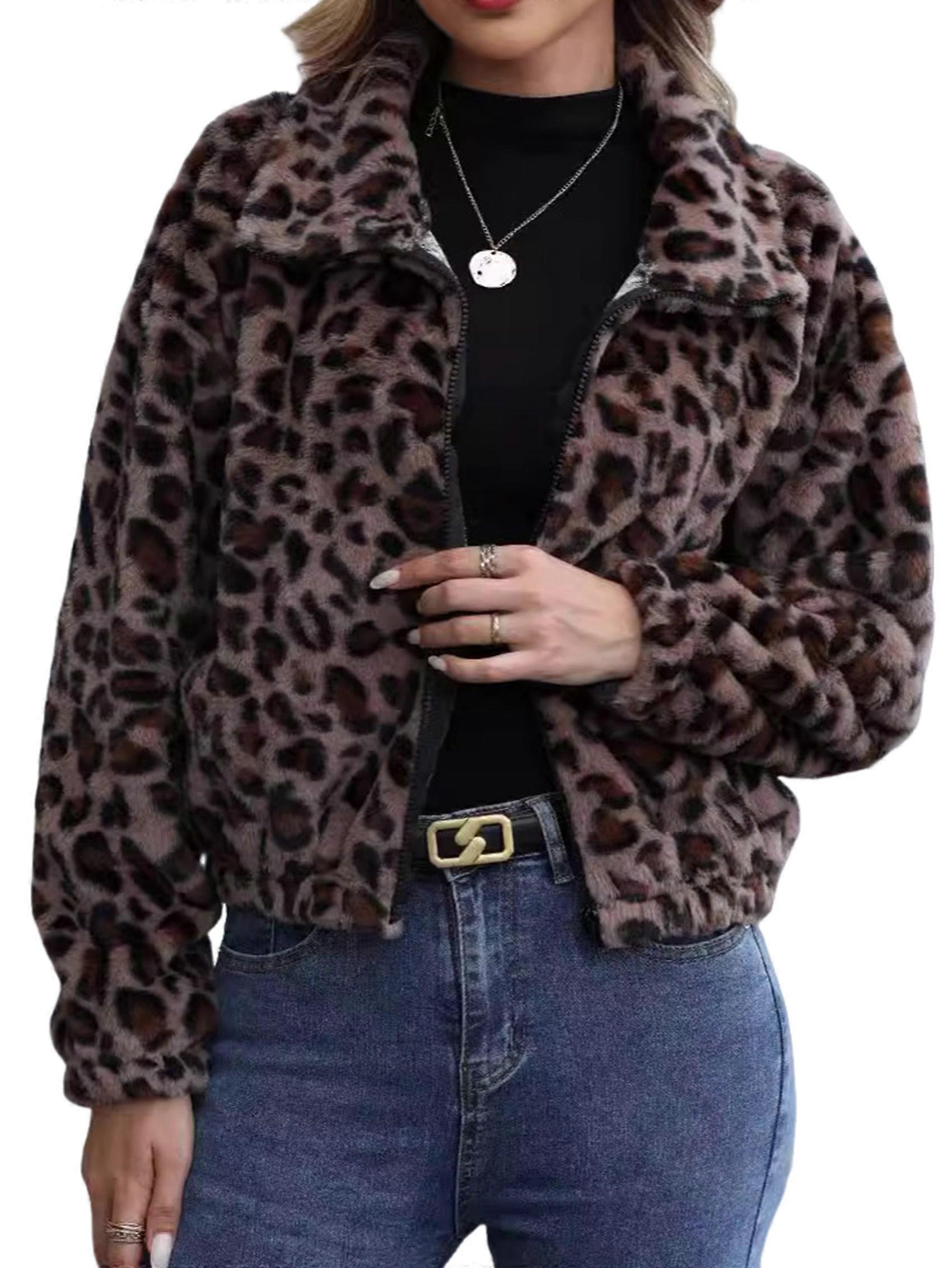 Womens Leopard Print Fleece Coat, Fashion Jacket Faux Fur Cardigan Overcoat L