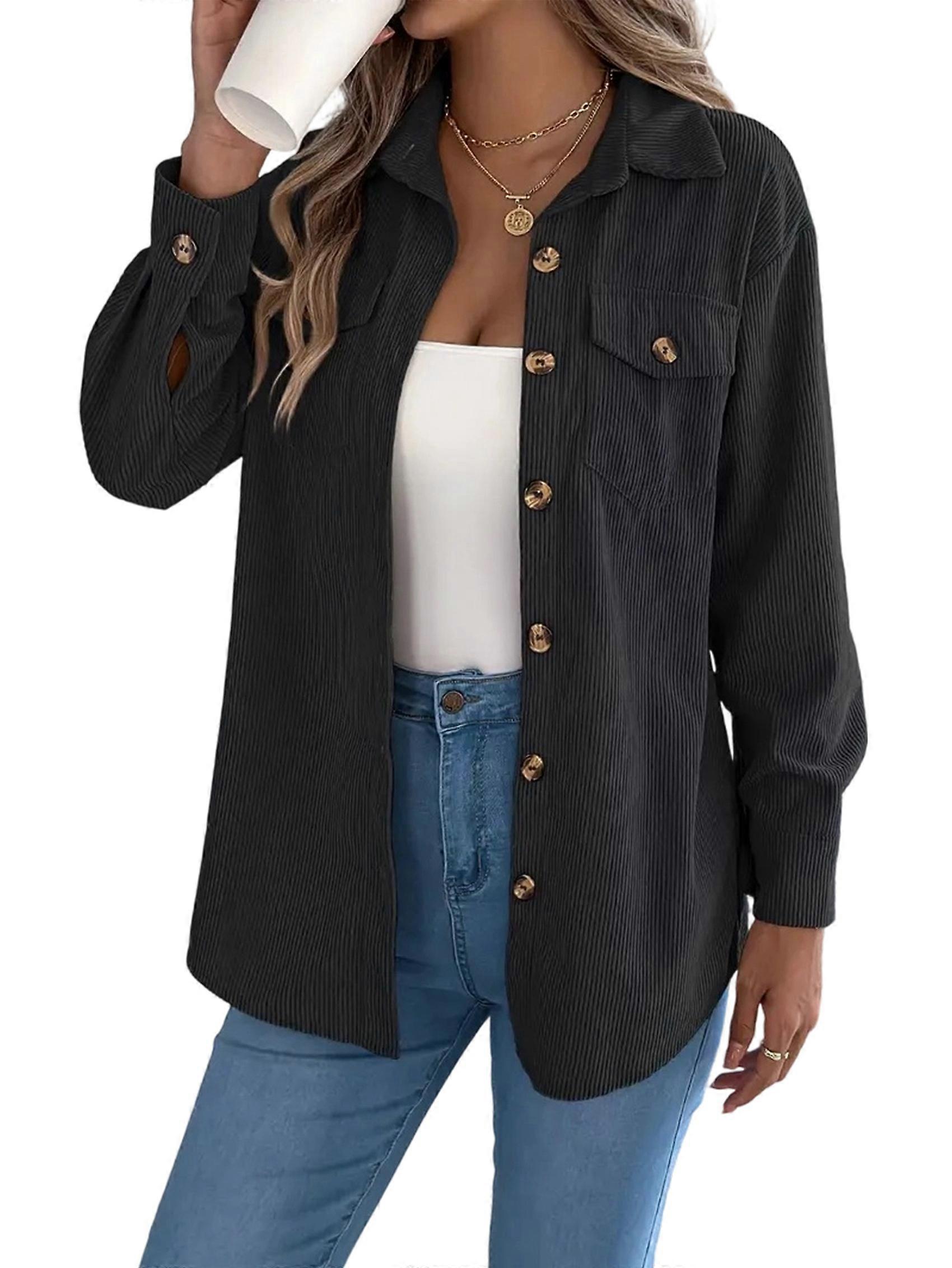 Womens Corduroy Shacket Blouses Button Down Shirts Pocket Long Sleeves Tops Jacket Coats Black S