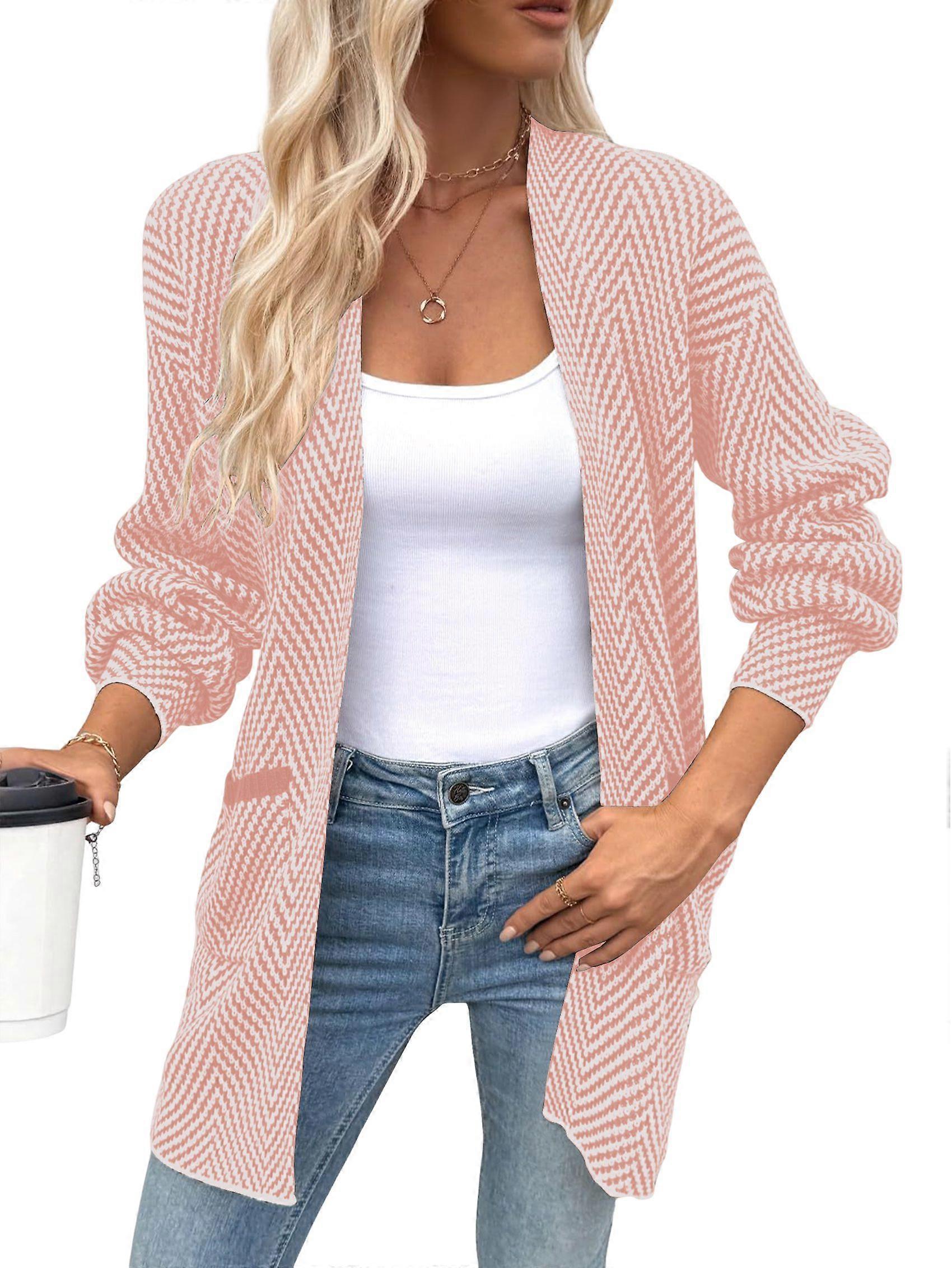 Women Fall Outfits Long Sleeve Open Front Striped Cardigan Sweaters Chunky Knit Sweaters Coat Pink XL