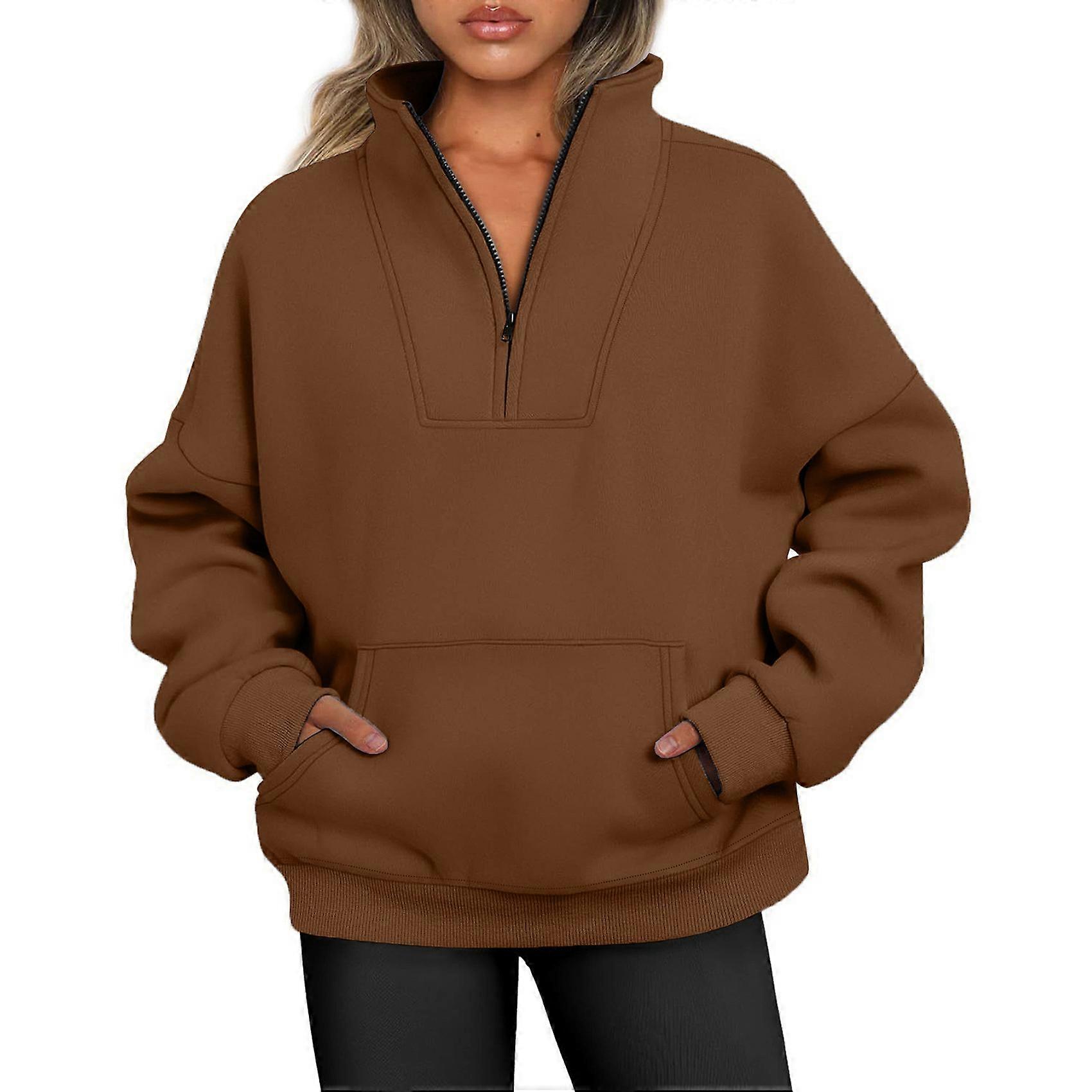 Women Sweatshirts Quarter Half Zip Pullover Oversized Hoodies Fall Fashion Winter Fleece Jackets Sweaters Brown M