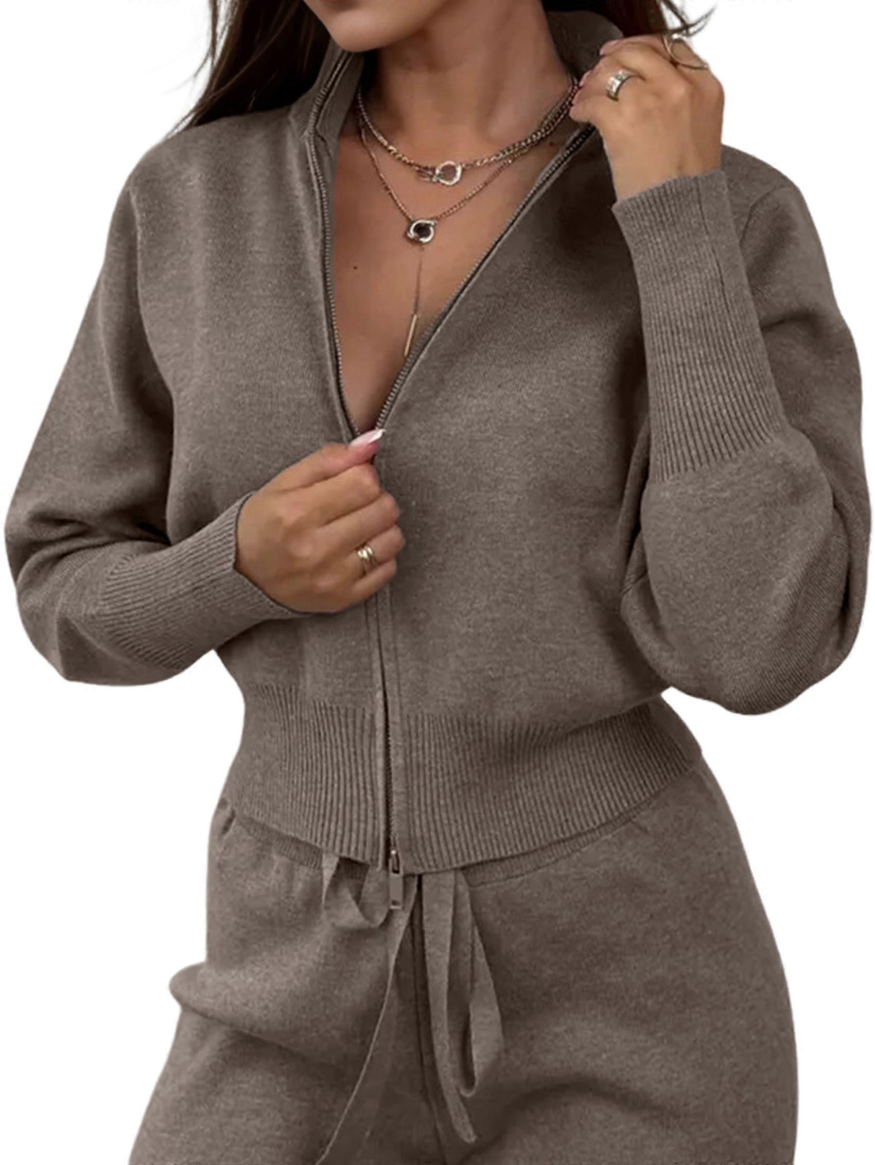 Female 2 Piece Outfits Lapel Long Sleeve Zip Up Sweatshirt Wide Leg Pants Matching Tracksuit Sets Light Brown M