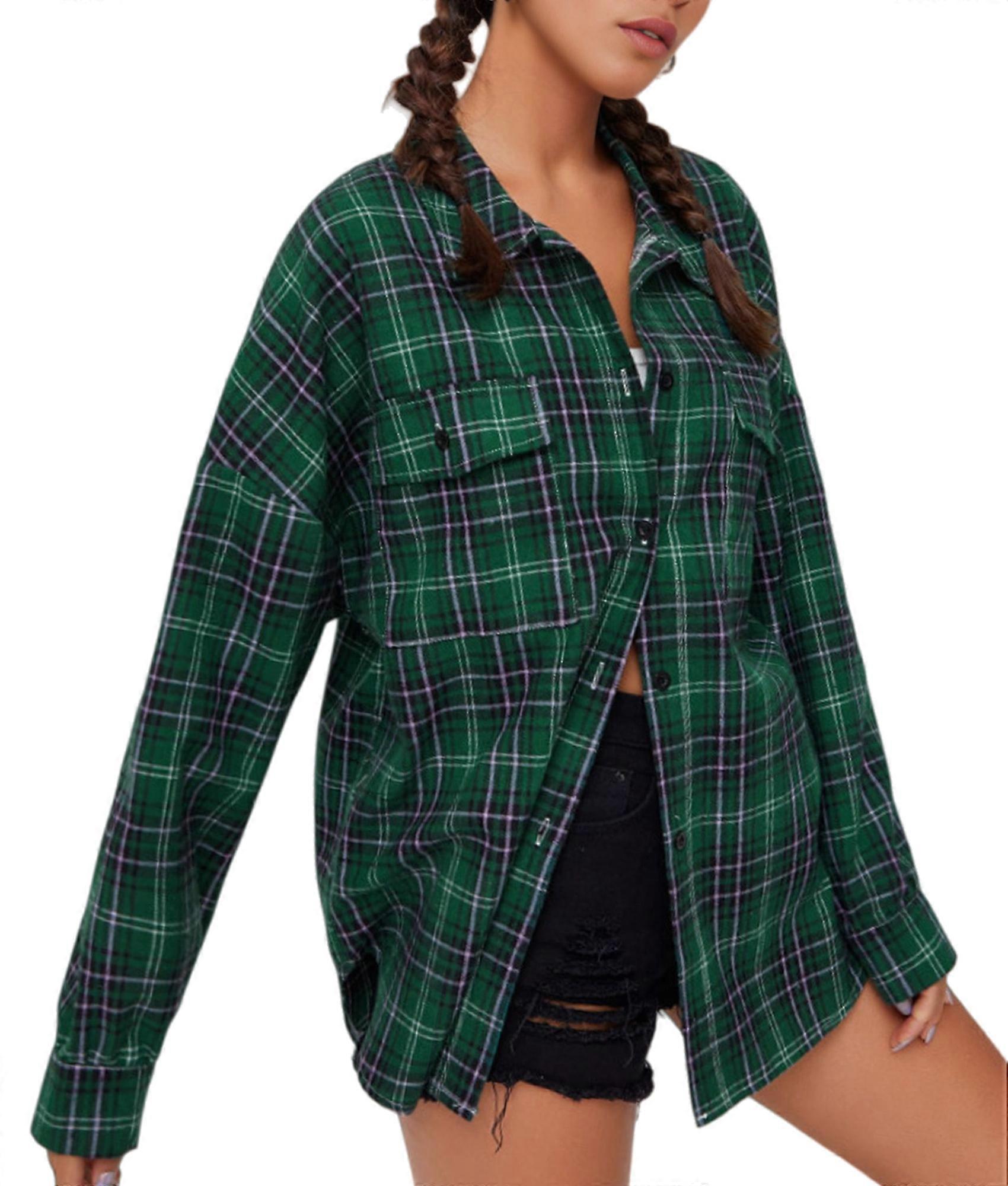 Button closure This casual plaid blouse features oversized style, drop shoulder, long sleeve, lapel collar, solid color, stylish design with two chest pockets This style button down shirt is easy to be matched with skinny jeans, classic jeans, pants, leggings, heels, etcThis is a basic and classic vintage short plaid shacket top for women, and it is suitable for date, travel, photography, home, daily or work wears This is a basic and classic vintage short plaid shacket top for women, and it is suitable for date, travel, photography, home, daily or work wears Size: XXL=US12=UK16=EU44(cm / inch) Bust: 136.0 / 53.54, Sleeve: 48.9 / 19.25, Length: 76.5 / 30.12, Shoulder: 79.0 / 31.10 Colour: Deep Green Material: 100% Polyester Package Contents: 1*Female Long Sleeve Plaid Shirt Tops Only the above package content, other products are not included. Note: Light reflection and different displays may cause the color of the item in the picture a little different from the real thing. The measurement allowed error is +/- 1-3cm.