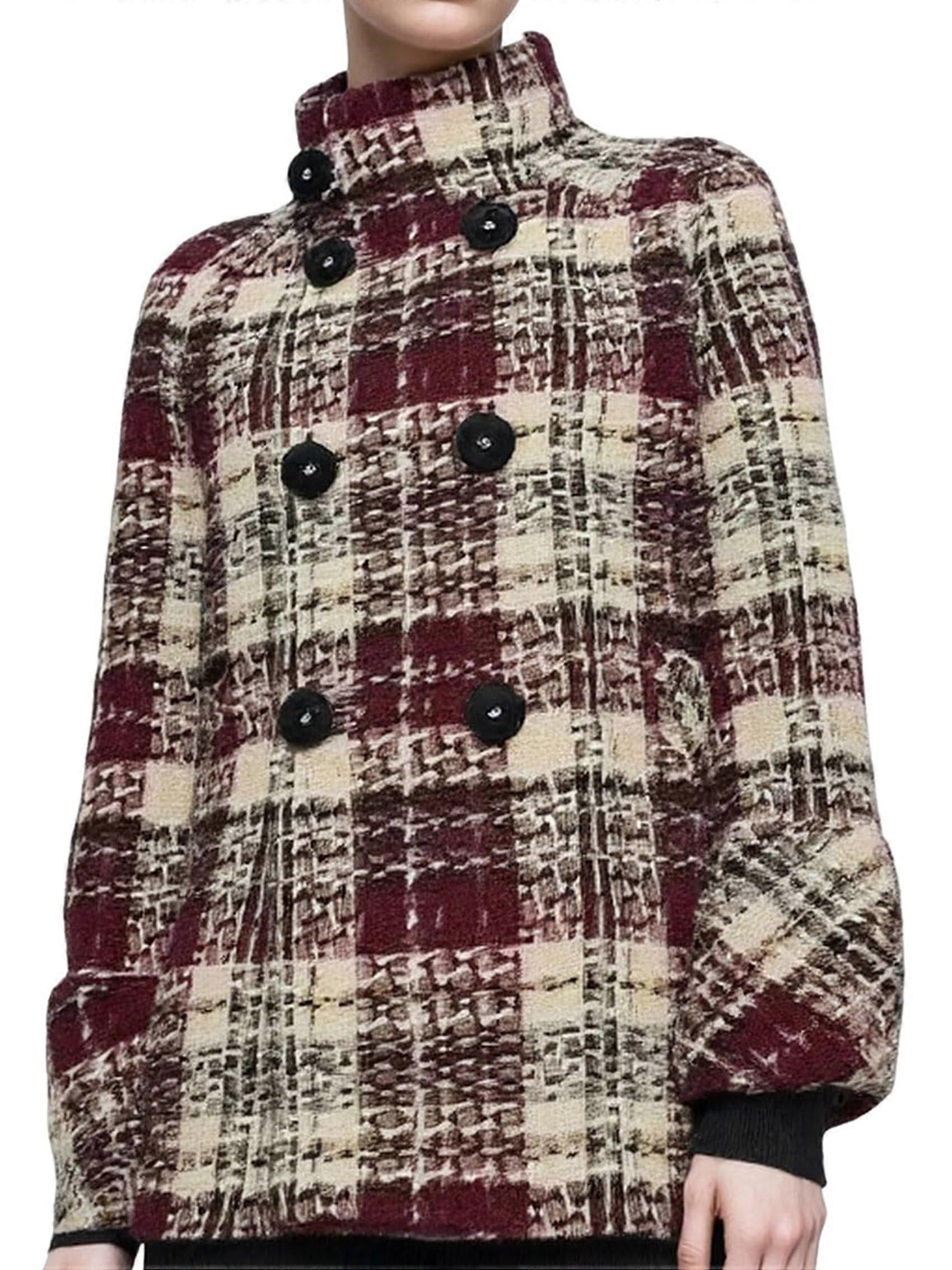 Womens Plaid Wool Trench Pea Coat Winter Dressy Double Breast Stand Collar Jacket Deep Red XXL