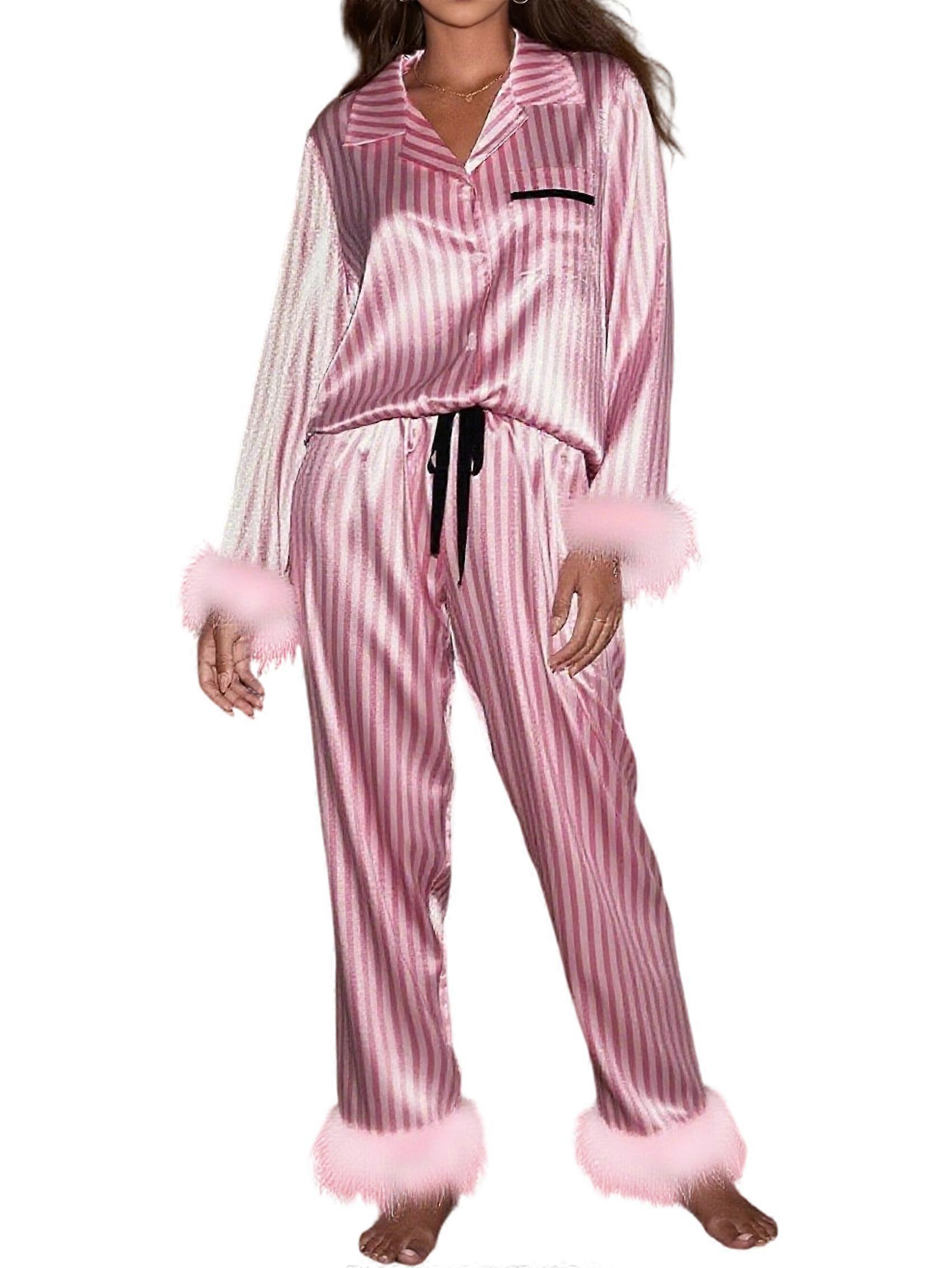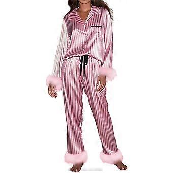 Womens Satin Pajama Set Classic Striped Silky Pj Sets Button Down Sleepwear Loungewear Pink XL